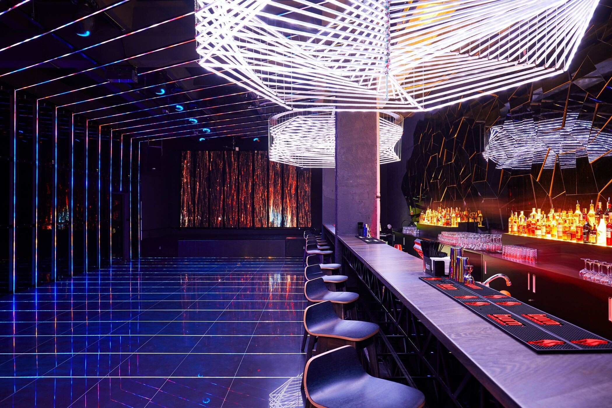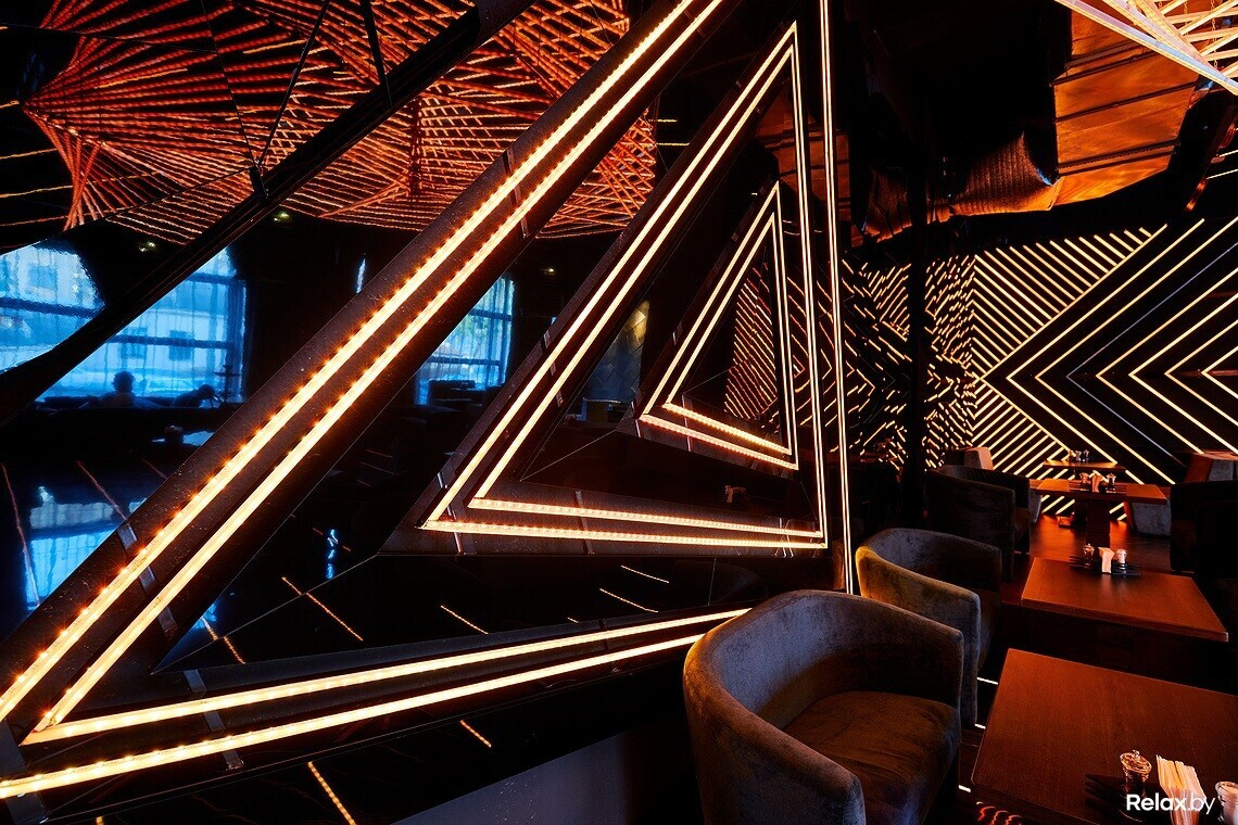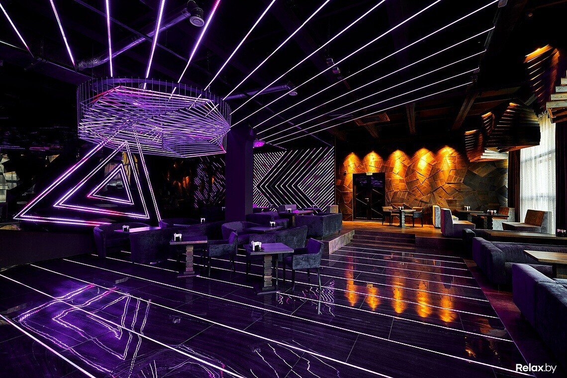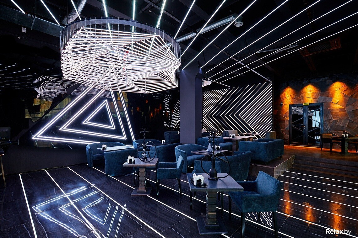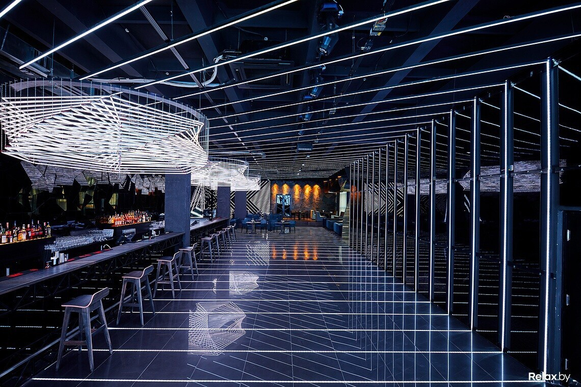 Пространство Prisma оформлено в стиле minimal future. Заведение наполнено светом, который отражается от глянцевых поверхностей, а под потолком висят футуристичного вида люстры.