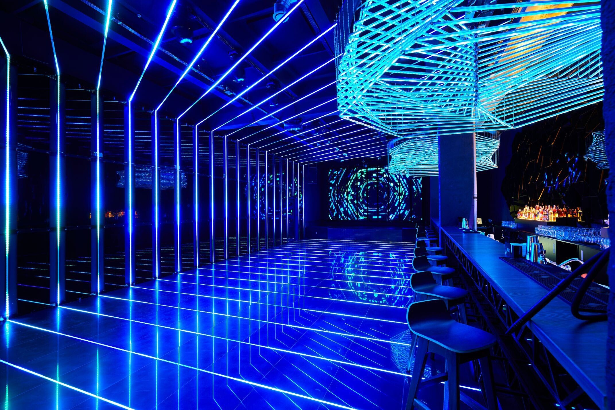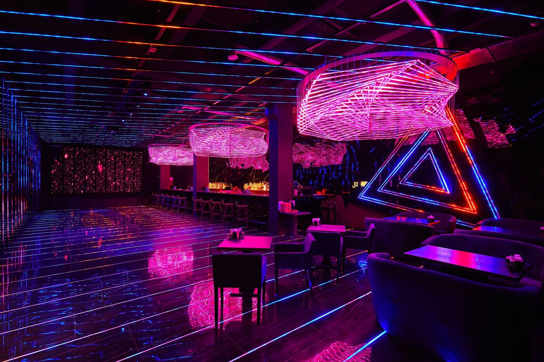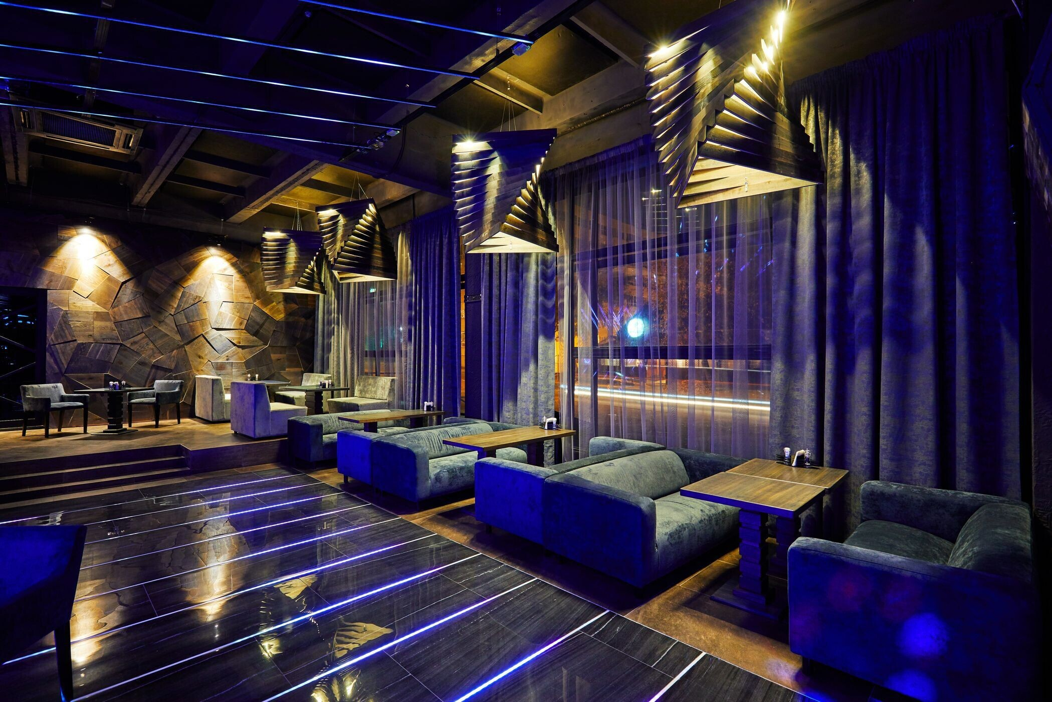 Пространство Prisma оформлено в стиле minimal future. Заведение наполнено светом, который отражается от глянцевых поверхностей, а под потолком висят футуристичного вида люстры.
