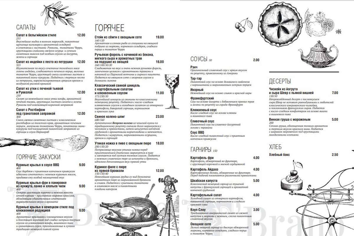 Внушительное меню будет включать пивные блюда и закуски, а алкогольная карта — классические коктейли, вина, крафт, экзотические виды пива и фирменные настойки бартендера.