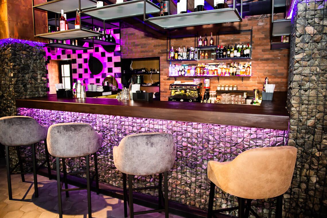 Все пространство второго этажа разделено на несколько зон. И главная его «изюминка», бесспорно, в оформлении: дизайнерских лампах и зеркалах, а также уникальной для Беларуси барной стойке в виде габиона — оцинкованной сетки из проволоки, заполненной камнями.