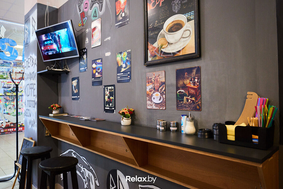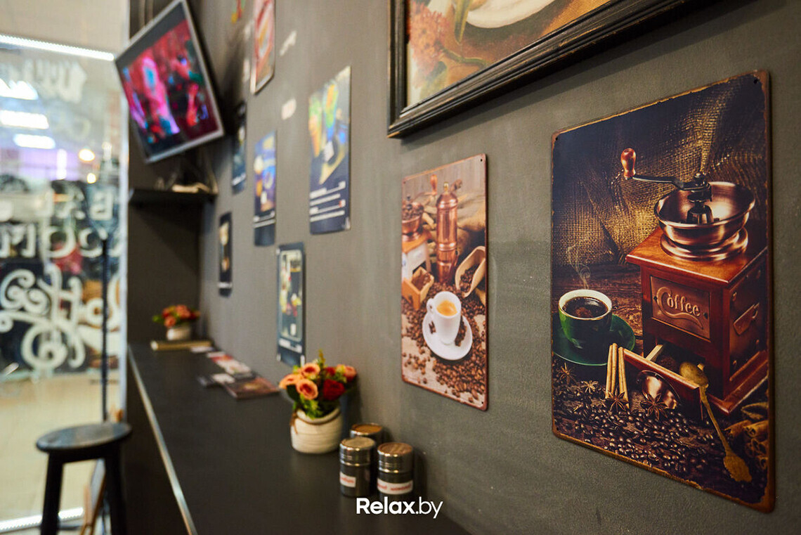 Помещение кофейни небольшое, но уютное: стены украшены картинами и граффити. Разместиться гости могут за столиком на четырех человек, диване или за бесконтактной барной стойкой.