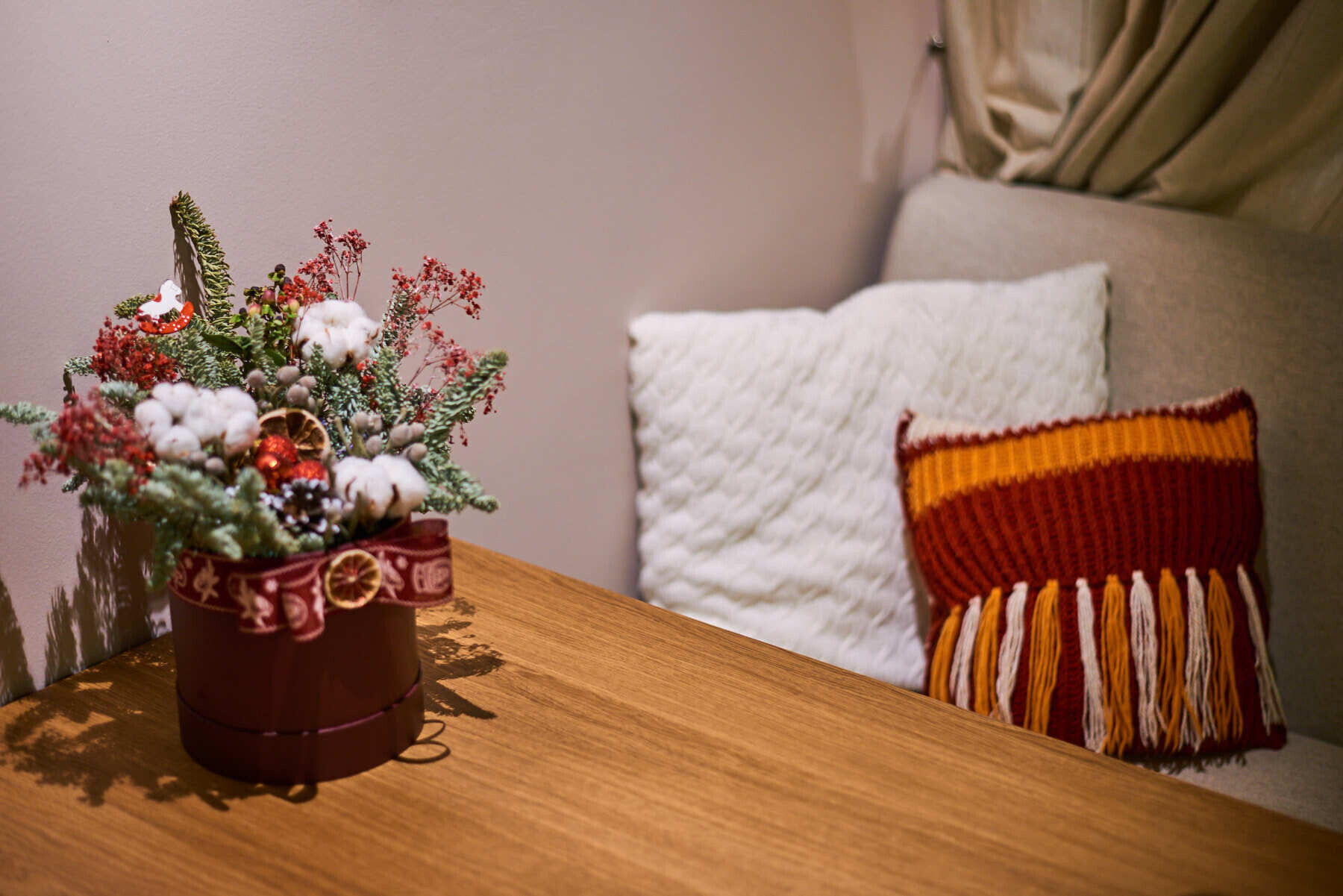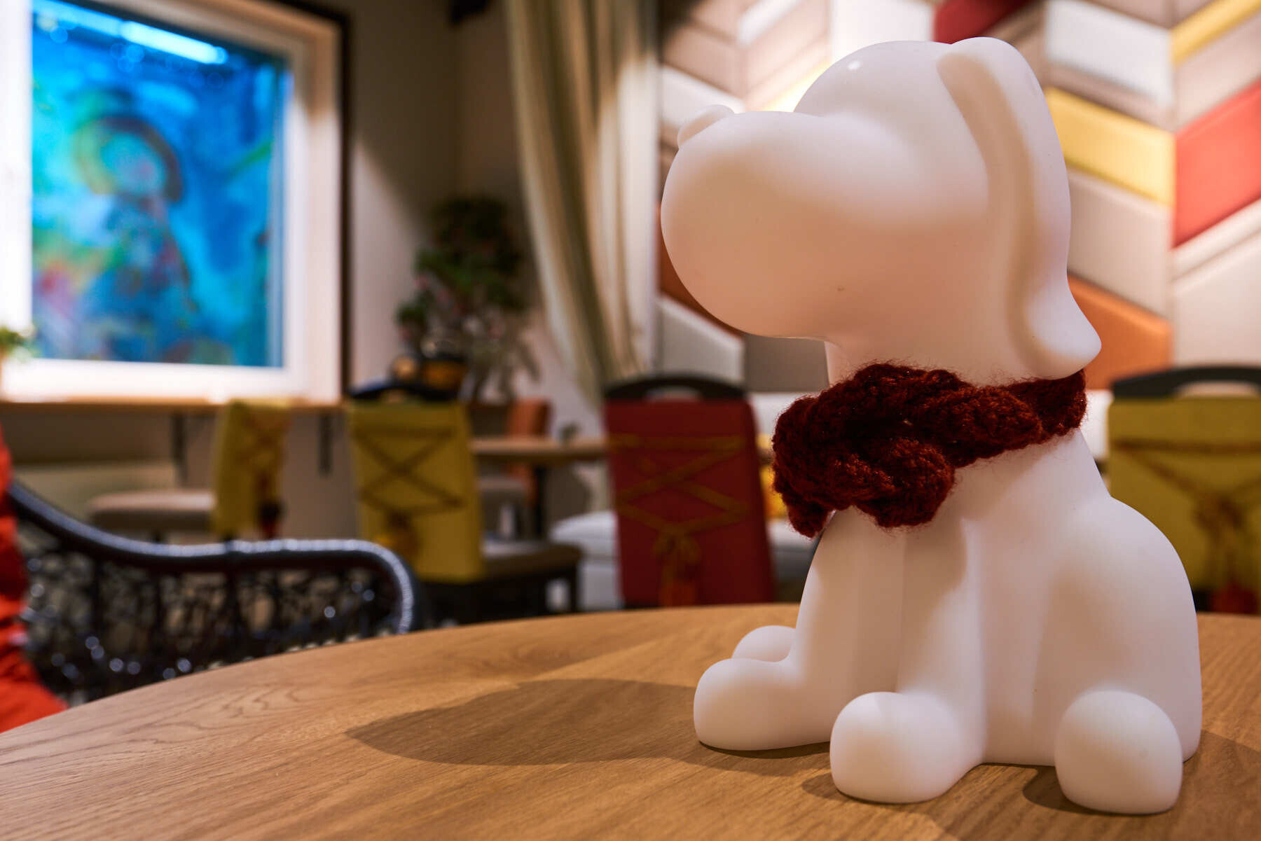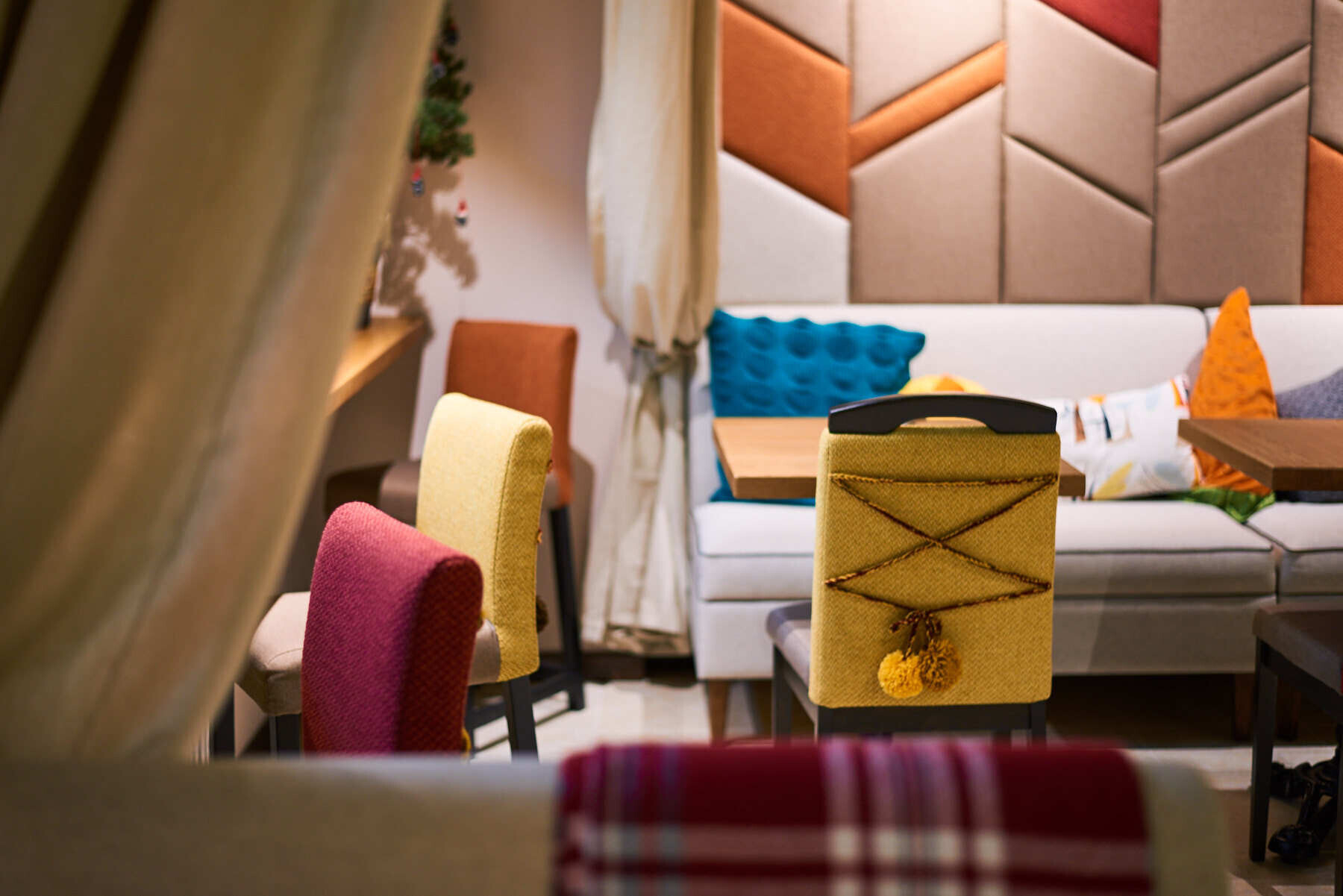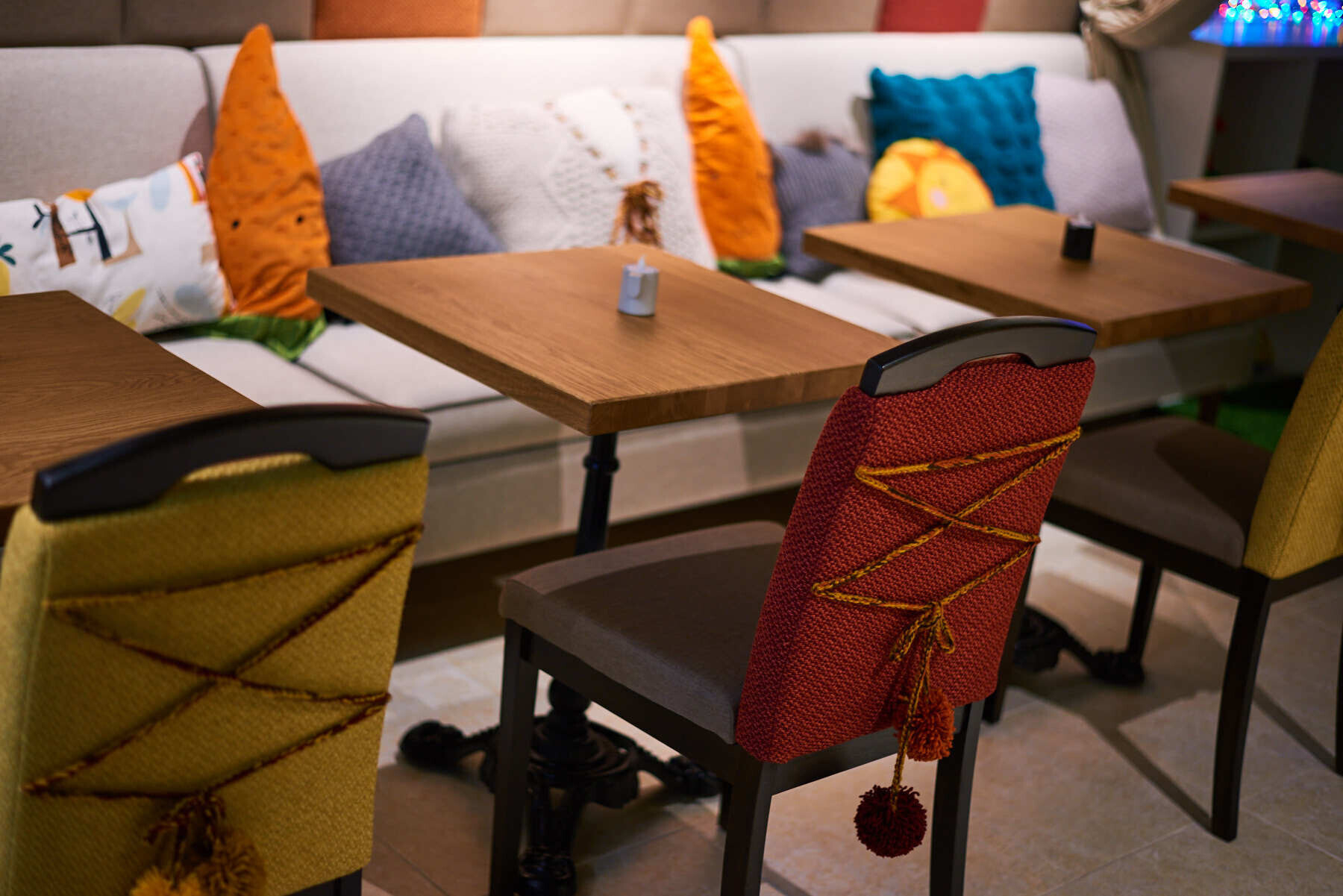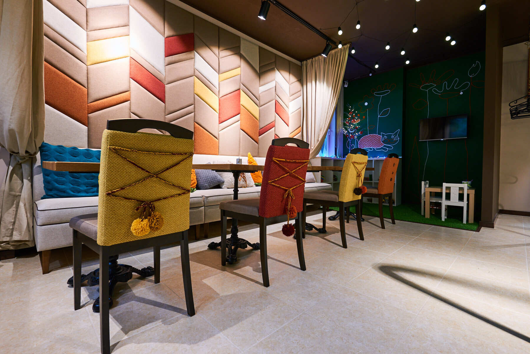Название кофейни тесно переплетается с интерьером. Все элементы — теплые, словно настоящие зимние кардиганы и свитера: чехлы для подушек, барная стойка, резной деревянный логотип создавались вручную.