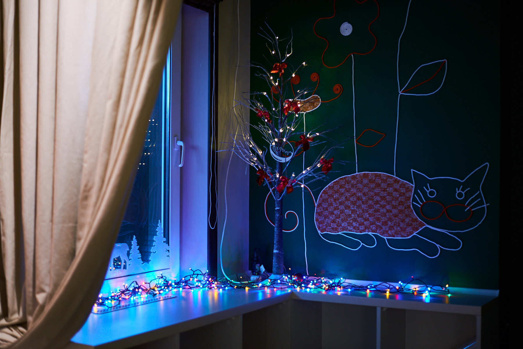 — В оформлении нам помогала дизайн-студия интерьера ILEDA. Многие детали, в том числе аппликация с котом, которую сейчас дополняют светящиеся фонарики, на стене в детской зоне — их идея.