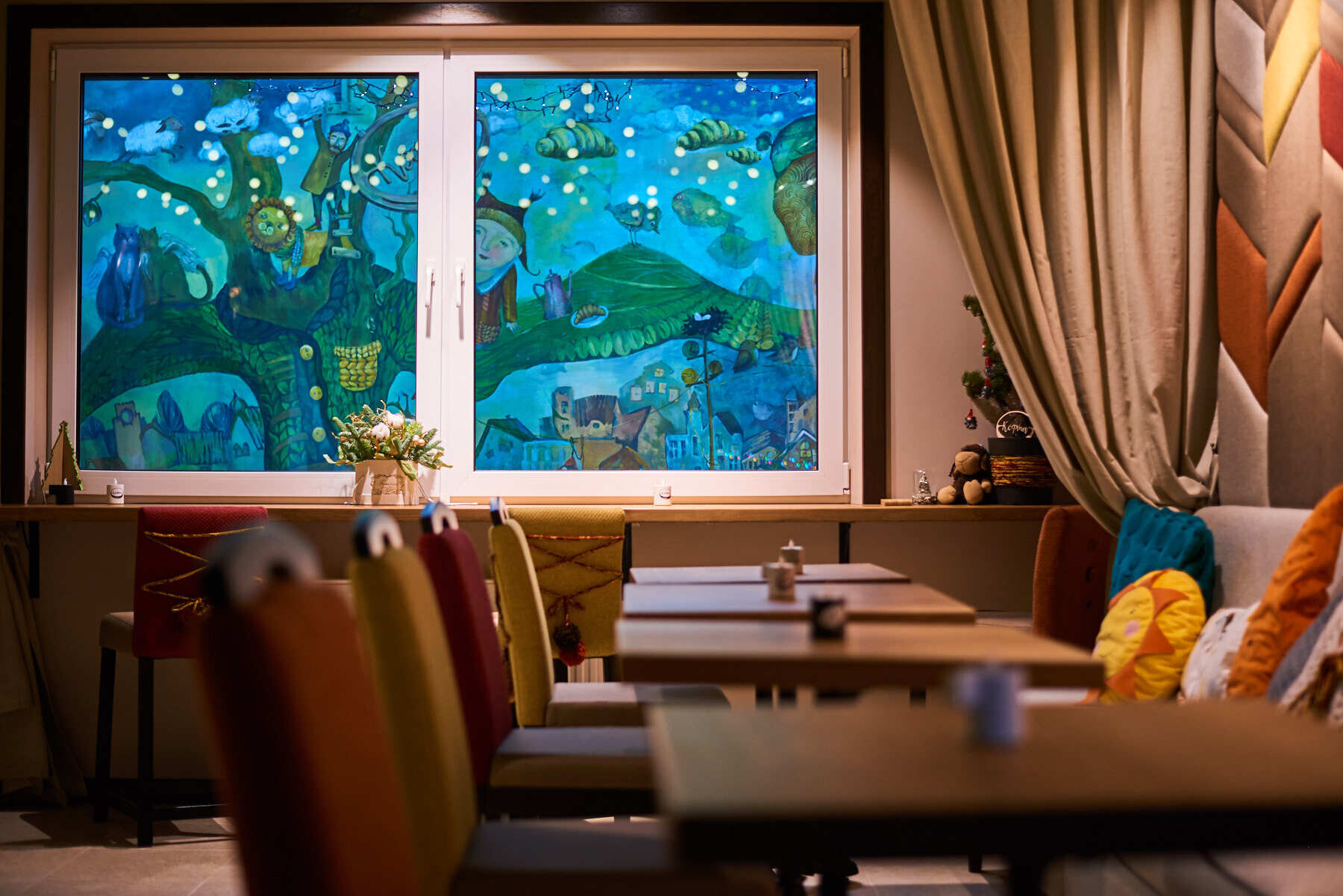 Ирина рассказывает, что изначально за окном кофейни была абсолютно серая стена. Слишком скучно и уныло. Так решено было превратить ее настоящую картину — сказочный город, в котором по небу летают овечки-облака и круассаны, а на дереве, одетом, конечно же, в вязаную кофту, живут парочка котов и лев.