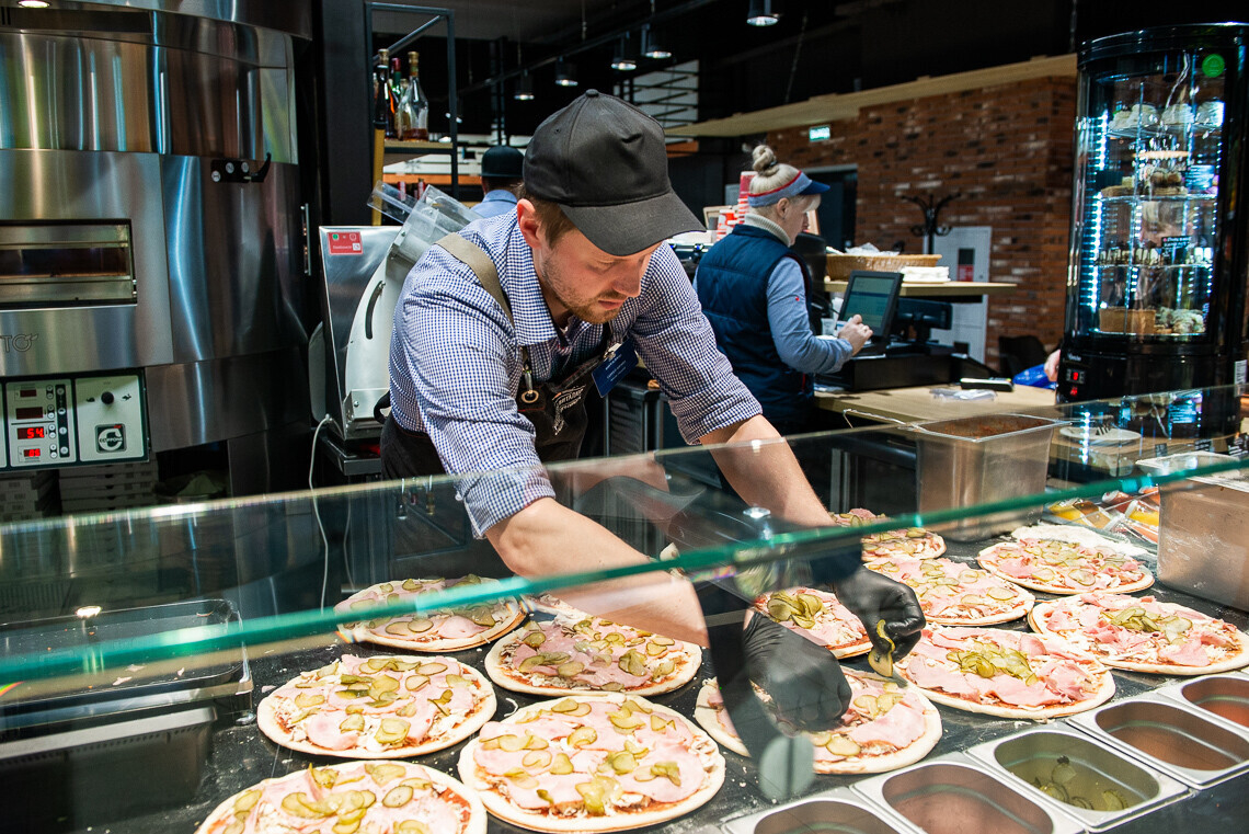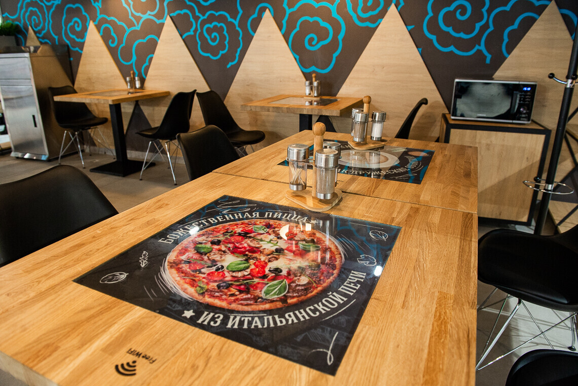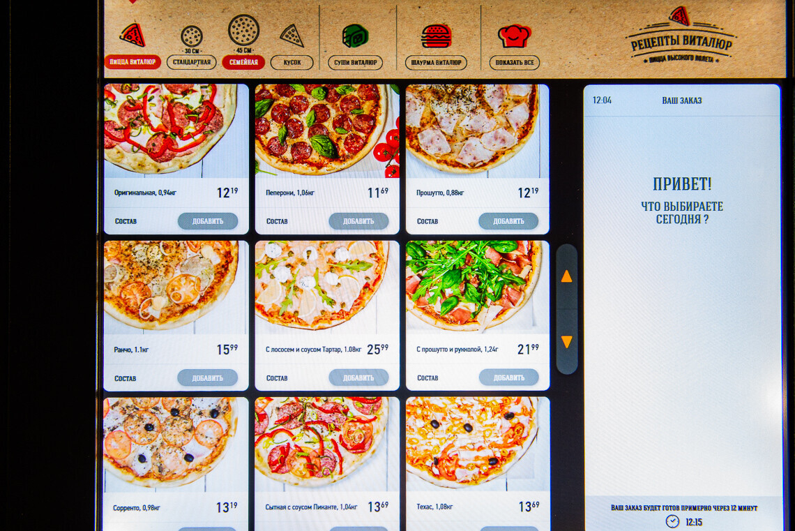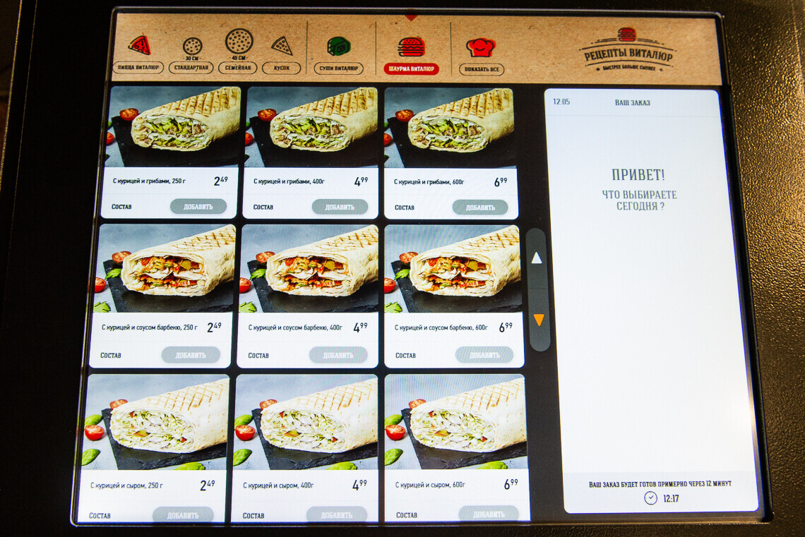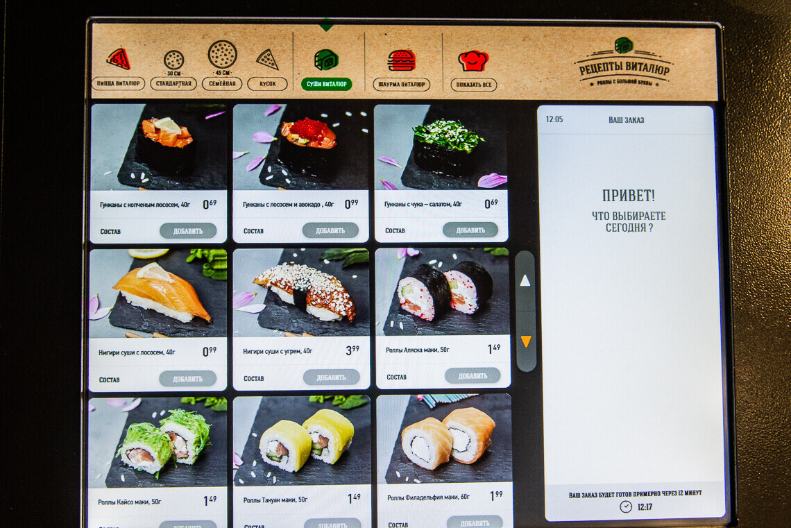 — Как это работает? К примеру, гость хочет заказать пиццу. Он выбирает нужную из предложенных в планшете вариантов. Программа рассчитывает время готовности и отображает его на экране клиенту. Если гостя это устраивает, он подтверждает заказ и получает купон с номером. В этот момент заказ появляется на мониторе у повара. Пока клиент изучает остальное меню, делает выбор напитков, десертов или, например, отправляется за покупками в торговый зал, его заказ готовится. Таким образом мы экономим время наших гостей. Сейчас так можно заказать пиццу, шаурму и суши.