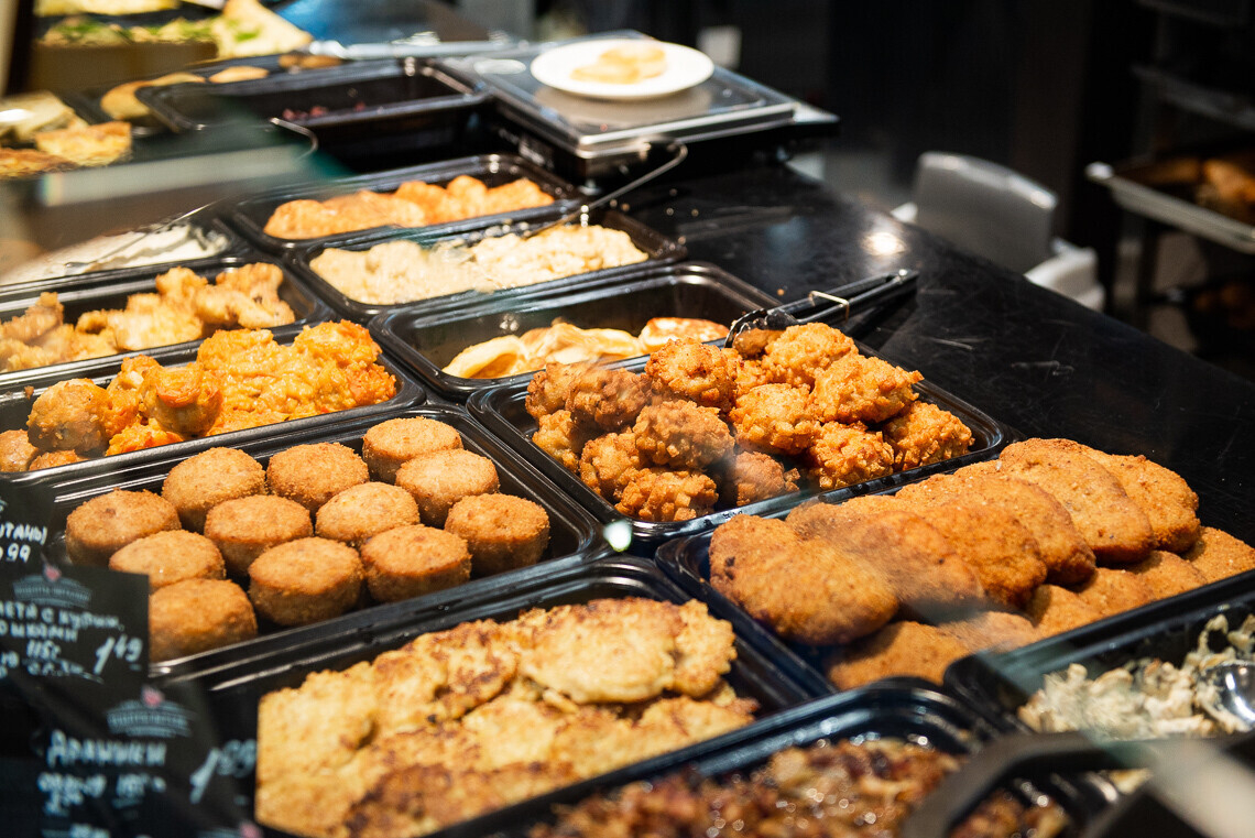 Меню фуд-корта разнообразно, но в то же время будет понятно и знакомо всем гостям. Акцент сделан на домашнюю кухню. Так, заказать можно гарнир — от 0,69 рубля за порцию. Столько, к примеру, будет стоить картофельное пюре. А к нему взять горячее блюдо из мяса или рыбы. Но если обычные котлеты уже не впечатляют, остановиться можно на бифштексе из говядины с яйцом — 4,99 рубля, тефтелях из птицы — 1,49 рубля или рыбных каштанах (филе трески, мясо креветки, масло сливочное, чеснок, укроп) за 2,99 рубля.