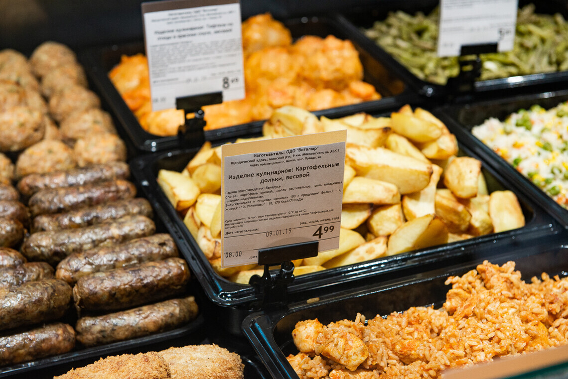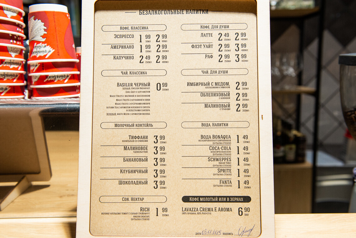 С 9:00 до 12:00 в супермаркете действует специальное меню завтраков, в котором предложены традиционные позиции: сырники, омлет с ветчиной, овсяная каша и блинчики. Стоимость блюд — от 1,99 до 2,99 рубля. А дополнят их сметана, клубничный или малиновый соус.