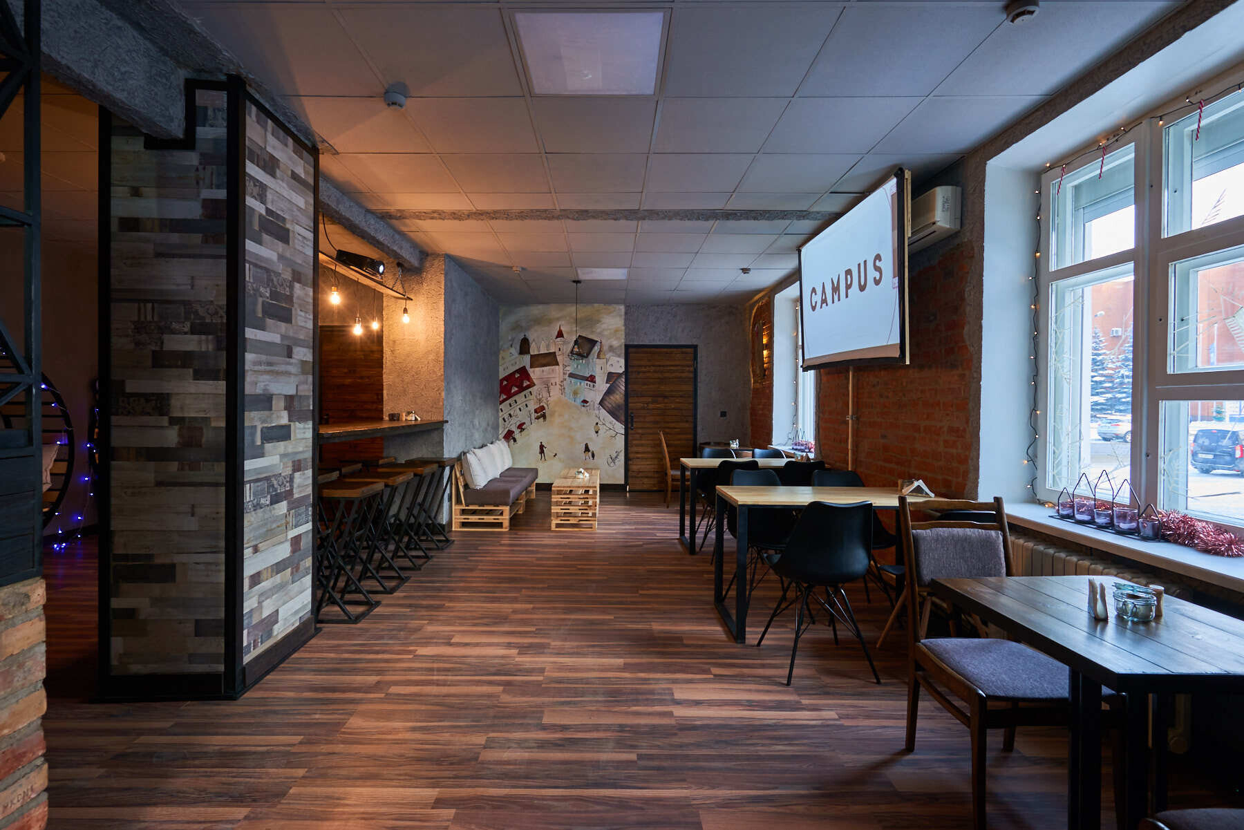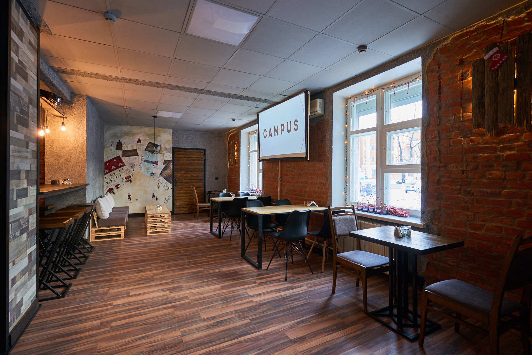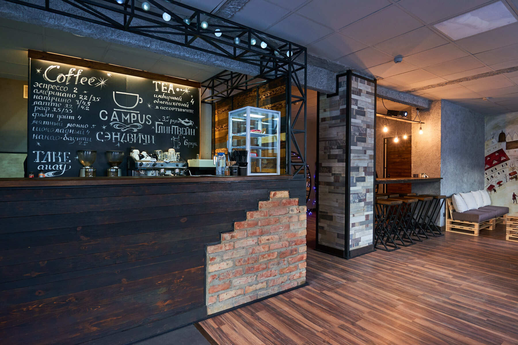Сейчас Campus работает в формате кофейни: «Мы начинаем понемногу развиваться: сейчас у нас пока что кофе, сэндвичи в течение всего дня, чай. Варим глинтвейн, потому что это согревающий зимний напиток, как раз для морозной погоды. Потом будем делать молочные и холодные напитки, панкейки, сейчас разработали рецептуру блинов — постепенно осваиваем меню».