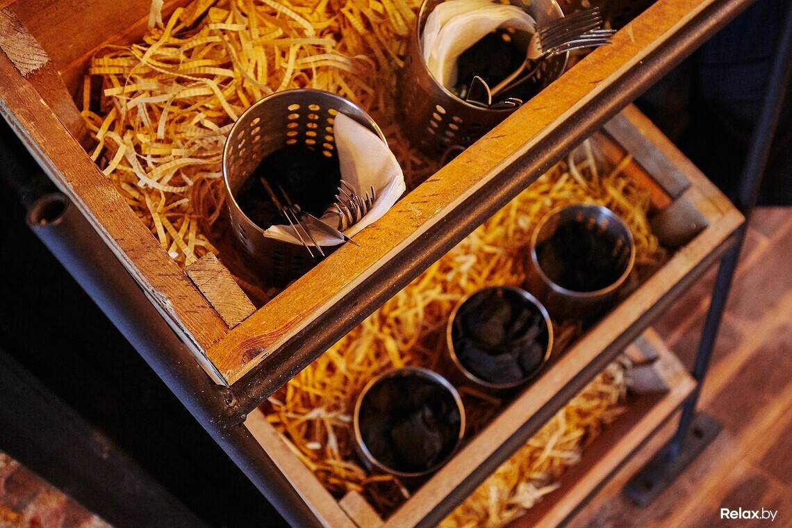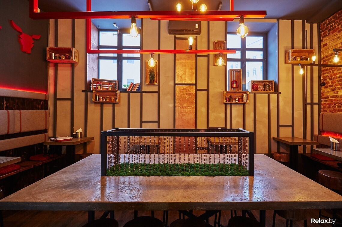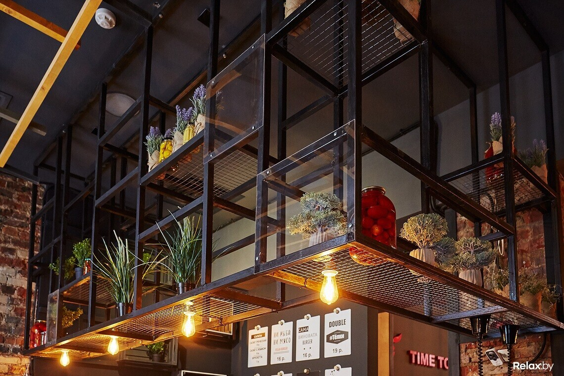 Интерьер сделали с уклоном в лофт, но значительно более уютный вариант за счет мягкого света. Жженое дерево, высокие стулья с сидушками из бревна, расставленные возле столов с брутальными массивными столешницами, задают характер всему помещению.