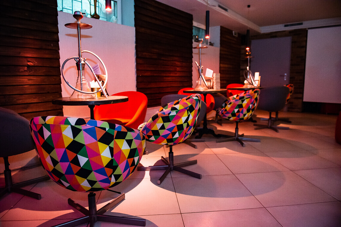 Интерьер в теперь уже кальянной остался прежний: с той же кирпичной и деревянной отделкой, зеркалами, яркими бескаркасными креслами-мешками и невысокими столиками. Место для сцены трансформировалось в уютное ложе с напольными диванами и мягкими подушками.