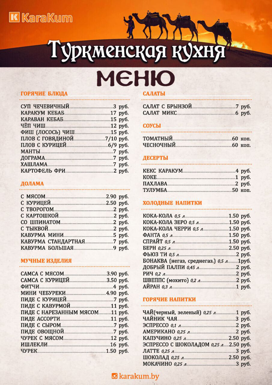 Кафе носит название одной из песчаных пустынь Туркменистана. Здесь будут предлагать традиционные блюда: плов, манты, дограма, долама, ишлекли, пиде и другие. Цены на позиции еды начинаются с 2 рублей.