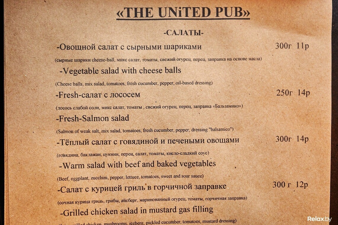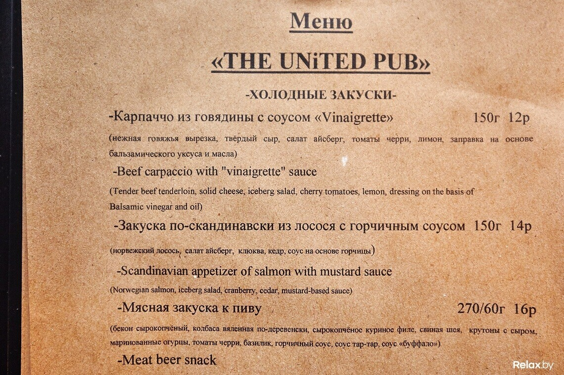The United Pub (Зэ Юнайтед Паб) — небольшой пивной паб, который открылся недавно возле ТЦ Dana Mall. В этом обычном, на первый взгляд, заведении есть полноценная авторская кухня, крафтовое пиво, а также широкий проектор, на котором будут транслировать спортивные матчи и крупные песенные конкурсы. Почему этот паб оценят не только любители футбола, читайте в обзоре Relax.by.