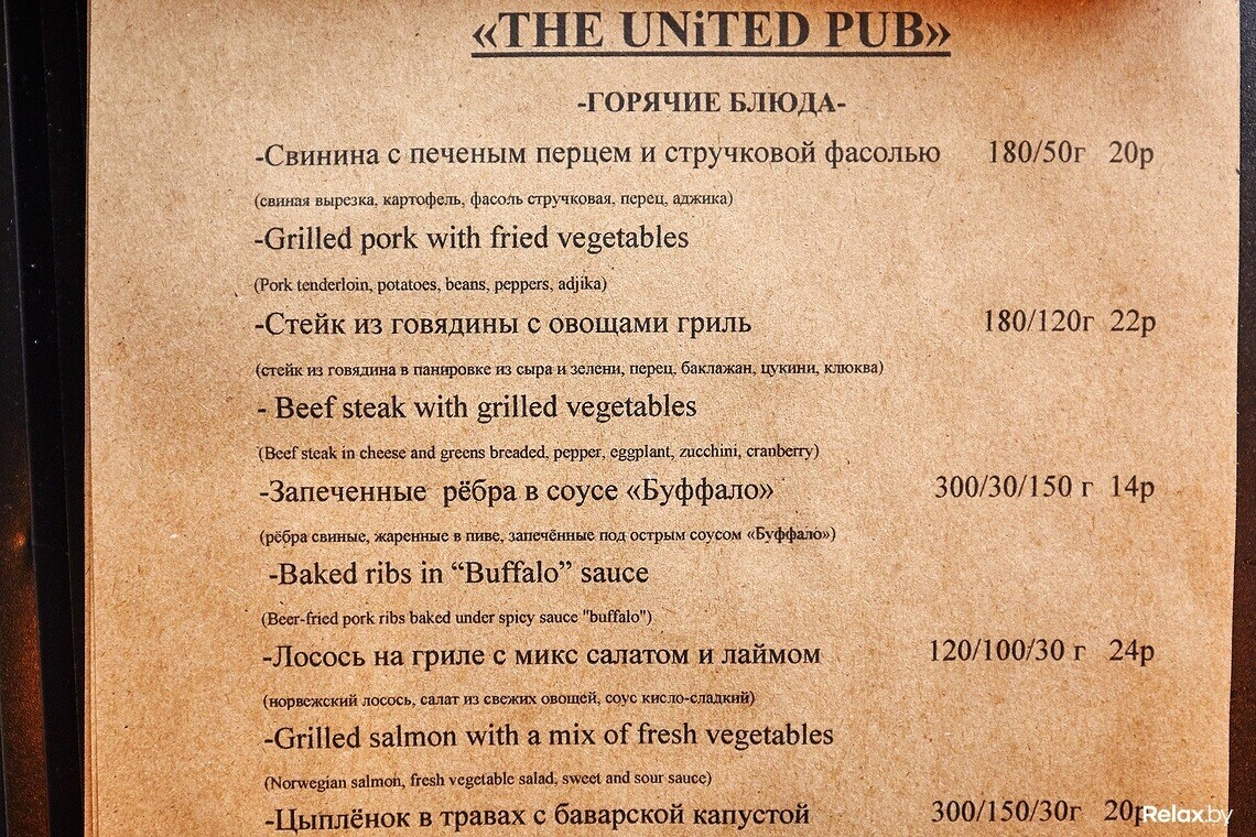 Например — 8 разновидностей бургеров, которые подаются здесь с авторскими соусами. Их цена — от 12 до 15 руб. Из горячих закусок к пиву есть сырные шарики с соусом тартар (10 руб.), куриные крылья (10 руб.), луковые кольца (9 руб.), ржаные гренки с сыром и чесноком к пиву (8 руб.) и т.д. Для тех, кто любит сытные горячие блюда, в The United Pub могут предложить большой выбор мясных позиций, в том числе — стейки, ребра, рыба и многое другое. На десерт — собственная выпечка, а также мороженое с заварным соусом Забальоне.