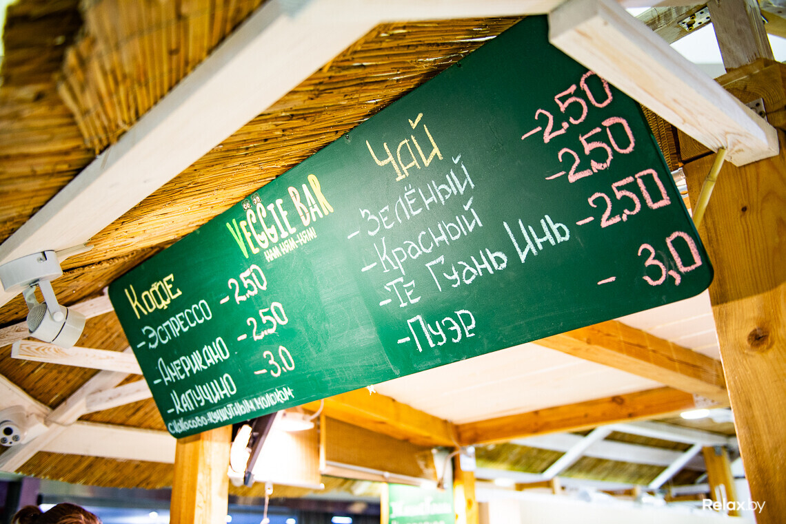 Заведение в виде бунгало условно разделено на две части. Слева находится Raw-еда, справа — Vegan. Этот же принцип характерен для стеллажей и витрин: слева гости увидят сыроедческие продукты, справа — веганские. К слову, все блюда, которые, кстати, готовятся тут же, на месте, в VEGGIE BAR подаются в экологичной картонной посуде.