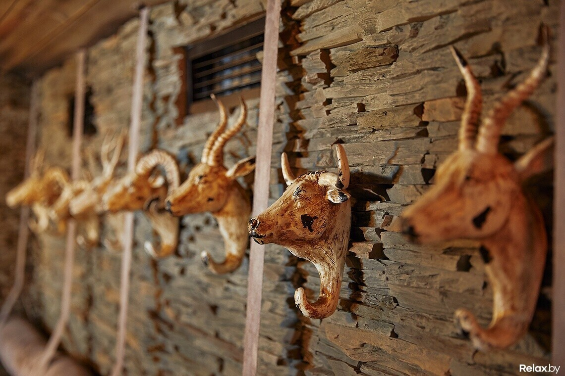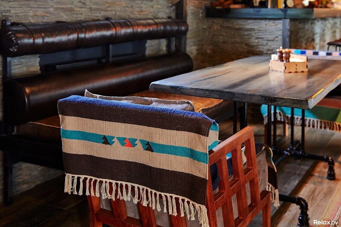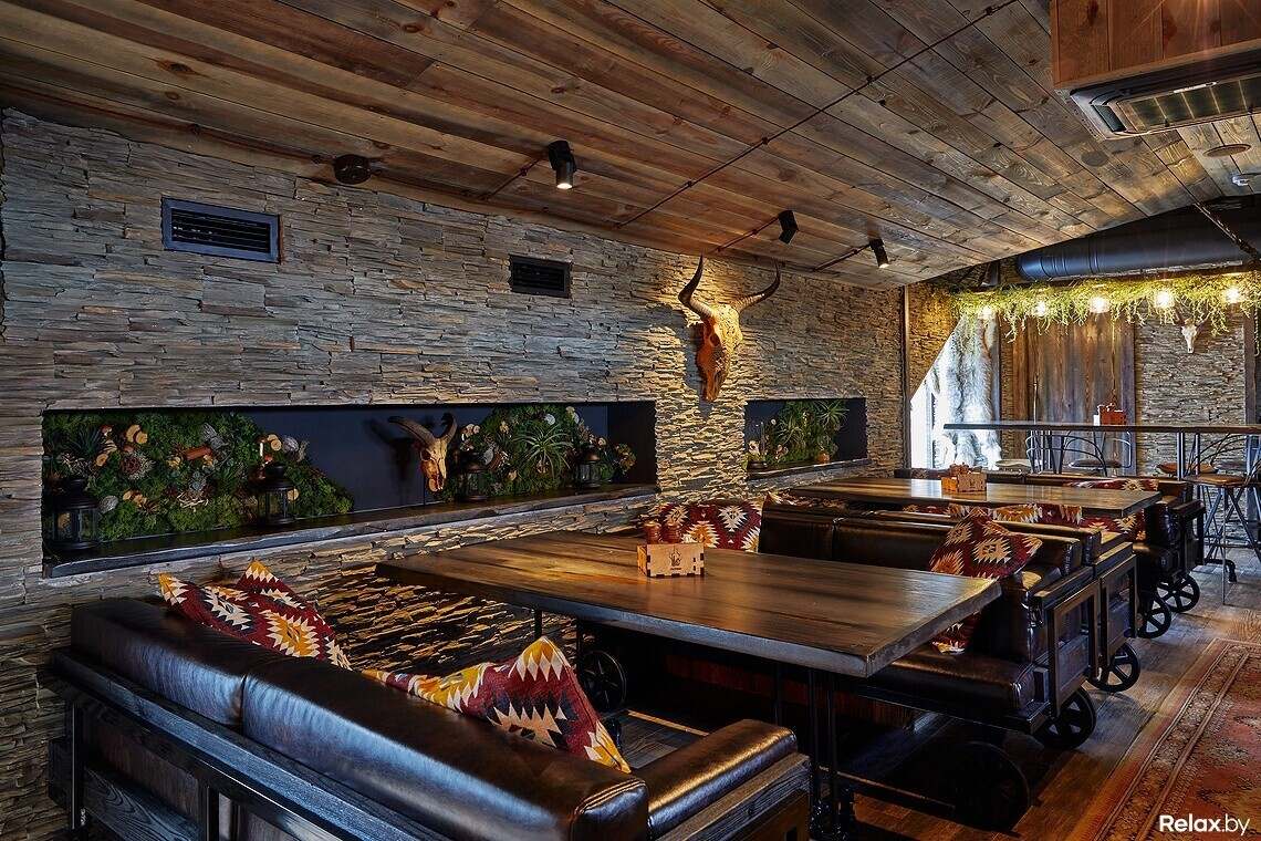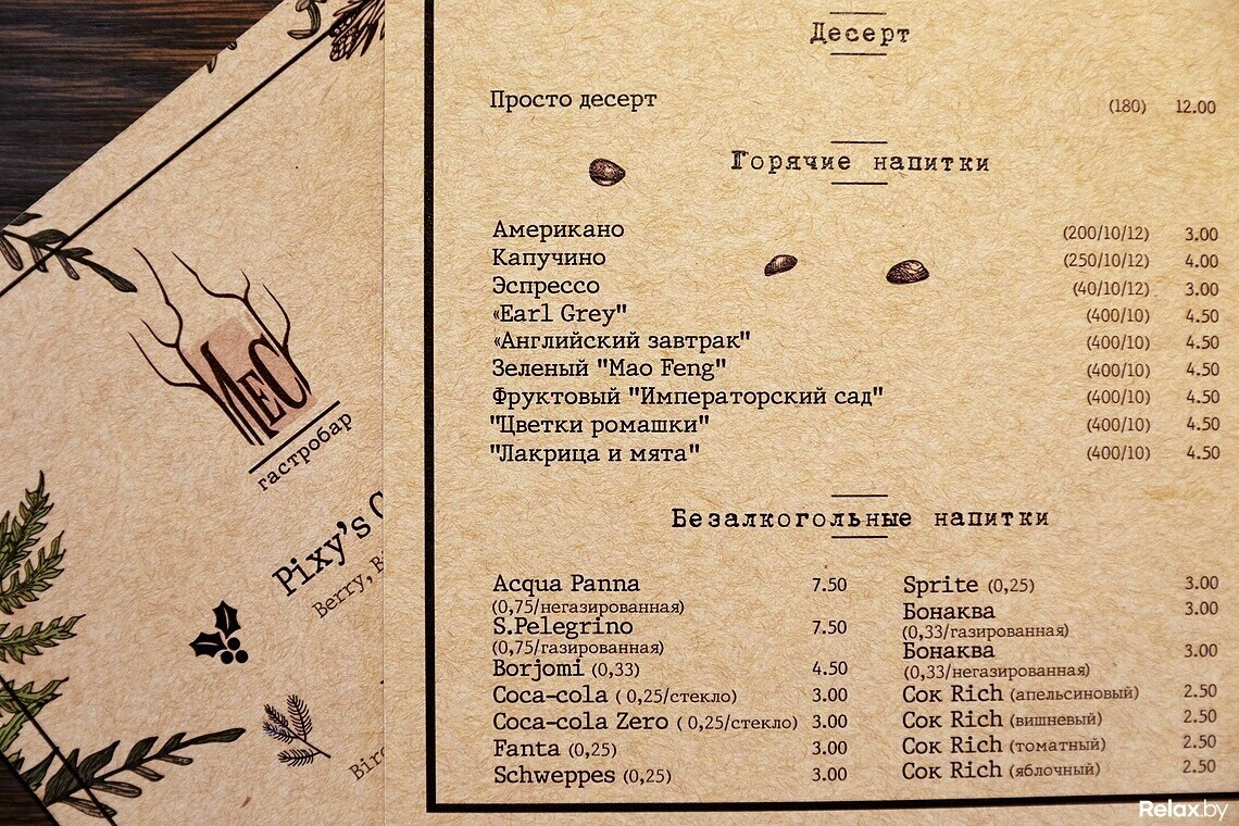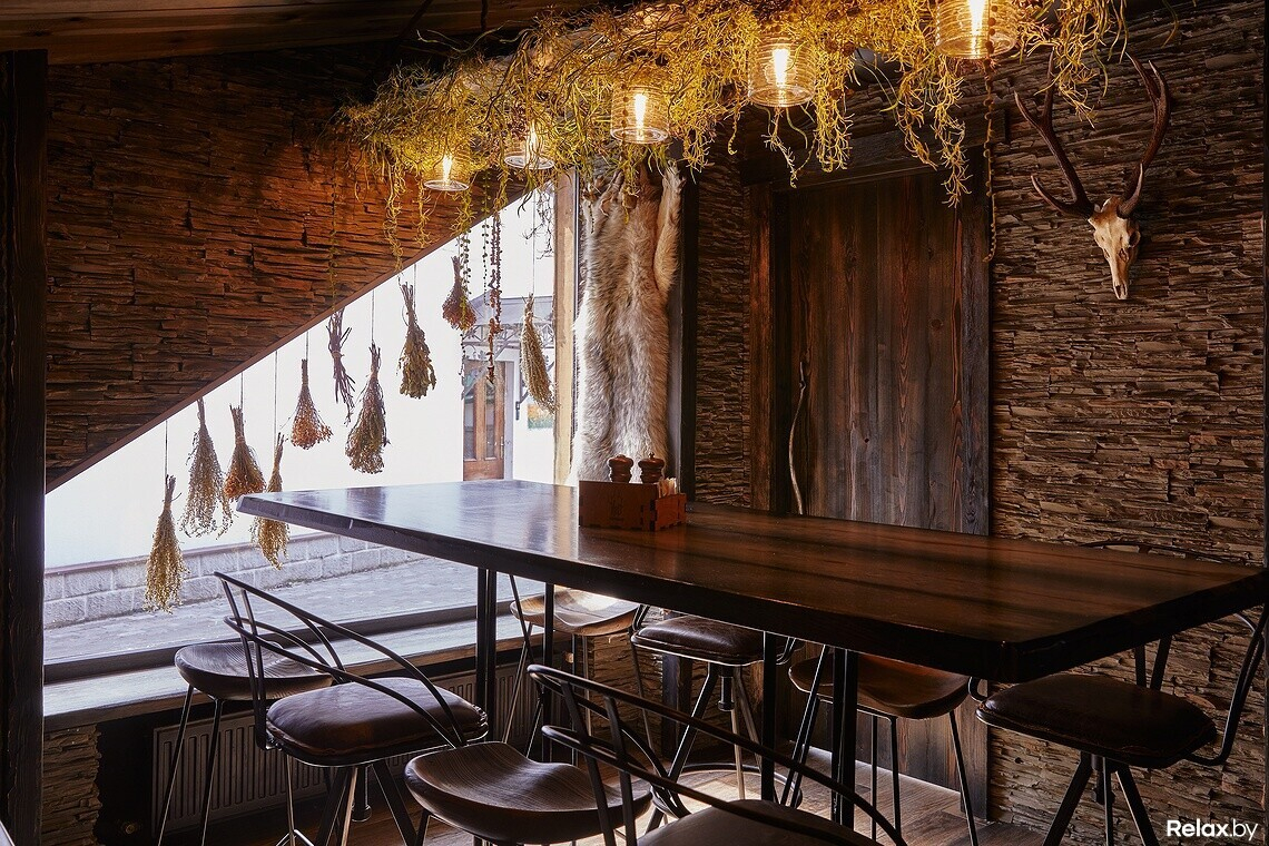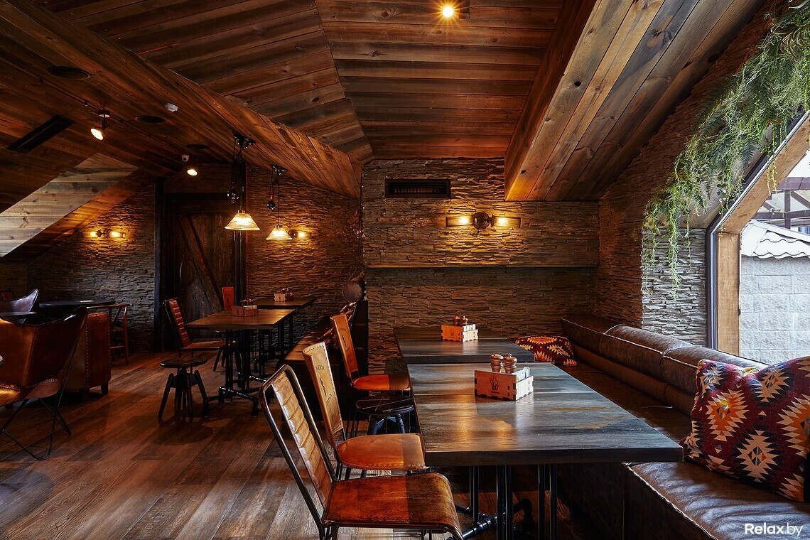Взятая за основу концепция леса прослеживается здесь не только в интерьере, но и в меню заведения. Оно максимально понятное, без вычурных наименований блюд, с основным акцентом на свежеприготовленное мясо. Есть здесь не только позиции из свинины — гриль-бургер за 15 руб, но и эксклюзивная строганина из оленя за 27 руб., домашний кабан на гриле — 25 руб.