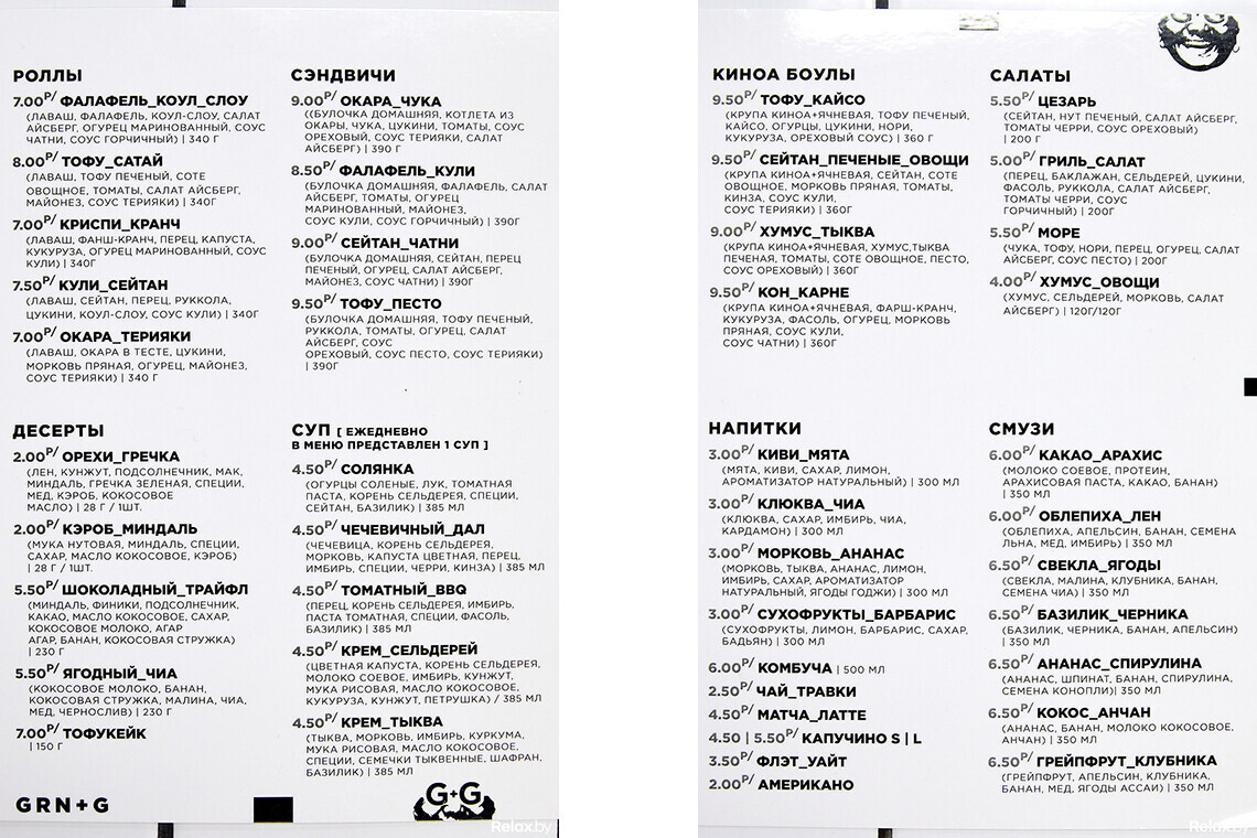 Меню для Green+Go разрабатывал шеф-повар, аюрвед и йог Алексей Король. Получилось оно максимально разнообразным. В кафе можно не просто забежать на перекус, захватив с собой сэндвич, — от 8,50 рублей, но и полноценно поесть: заказать суп — 4,50 рублей, салат — от 4 рублей или киноа боул — от 9 рублей.