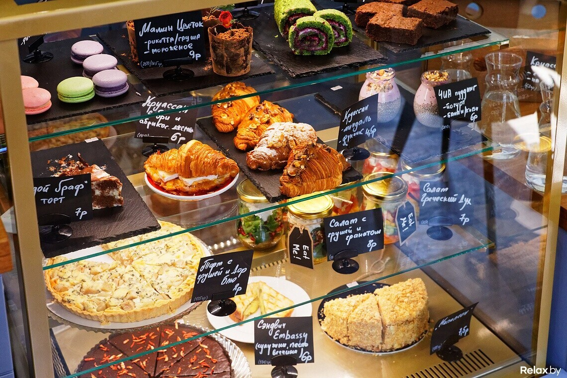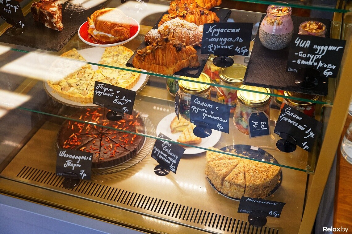 Сегодня Embassy предлагает сладкие десерты, выпечку, сэндвичи, салаты. Как рассказывает Татьяна, все позиции свежие и большинство из них — своего производства по семейным рецептам. Кстати, продумывая меню, Татьяна и Александр учитывали и мнение будущих посетителей: