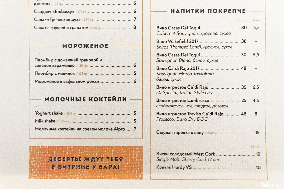Среди стандартных кофейных напитков в меню можно найти и оригинальные варианты: например, кофе в шоколадном рожке за 6 рублей и айриш-кофе на основе ирландского виски за 7 рублей. Также заказать можно чай, какао, вино — от 4,50 рублей за бокал и сырную тарелку к нему за 15 рублей. Есть в Coffee Embassy и крепкий алкоголь.