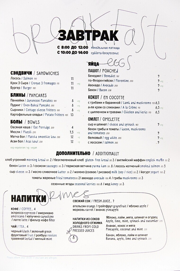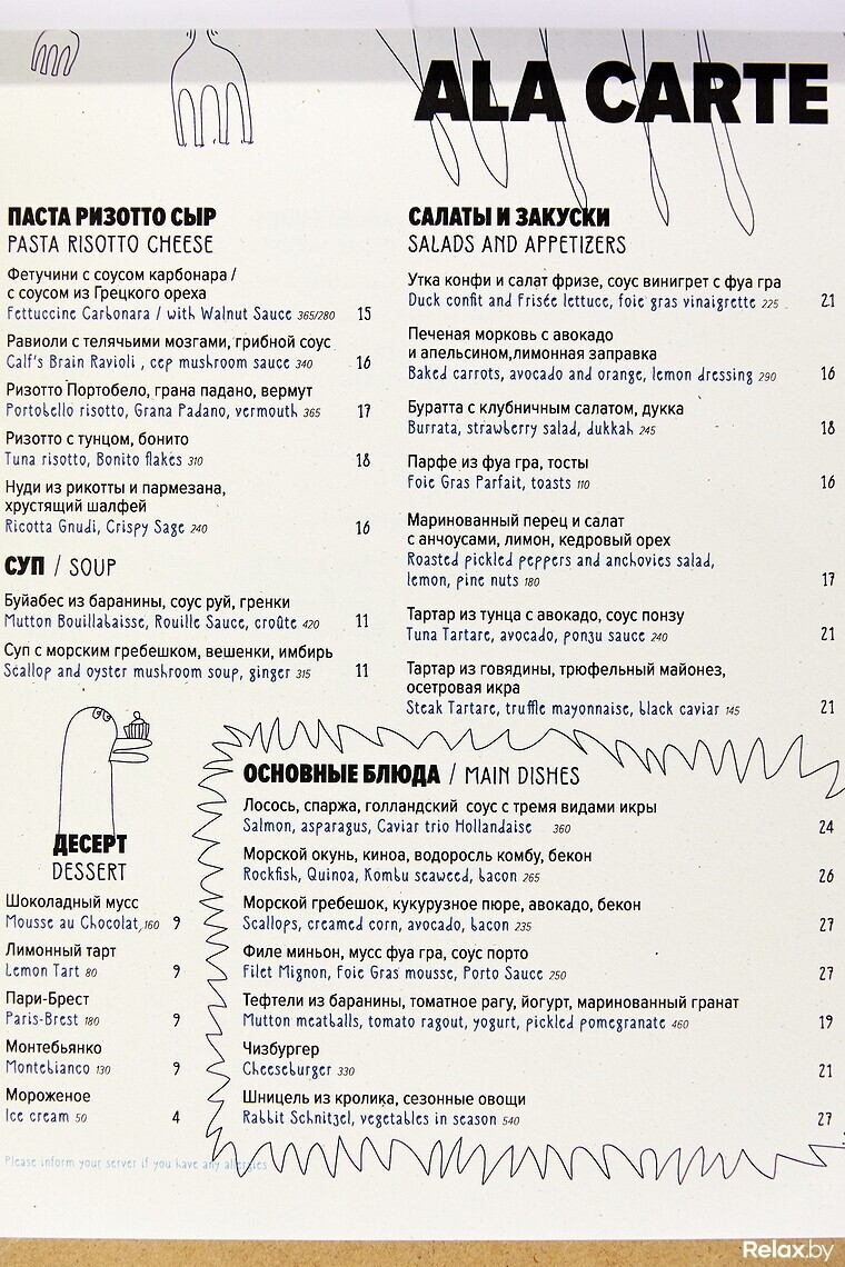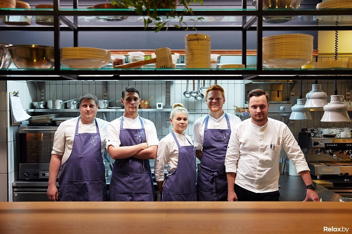 «Вкусы гостей со временем меняются, а повара хотят экспериментировать. Поэтому мы выбрали формат comfort casual food for fair price — это высокое качество продуктов с комфортной ценой. Закуски у нас стоят от 15 до 21 рубля, а горячие блюда — от 16 до 27 рублей. Меню лаконичное, поэтому повара имеют возможность использовать для этих блюд лучшие продукты, которые есть на рынке сегодня. Идея исключительно французской кухни не совсем нам интересна. Если в стране есть неплохой тунец или лосось, а у нас есть замечательный рецепт и он совсем не из французской кухни, то почему бы его не приготовить? Или отличный кролик, из которого мы готовим шницель. Сейчас вот сезон спаржи, мы закупаем ее у частного хозяйства».