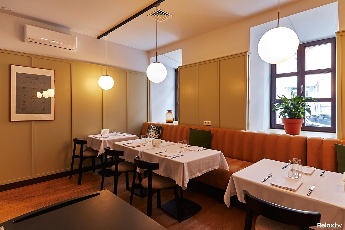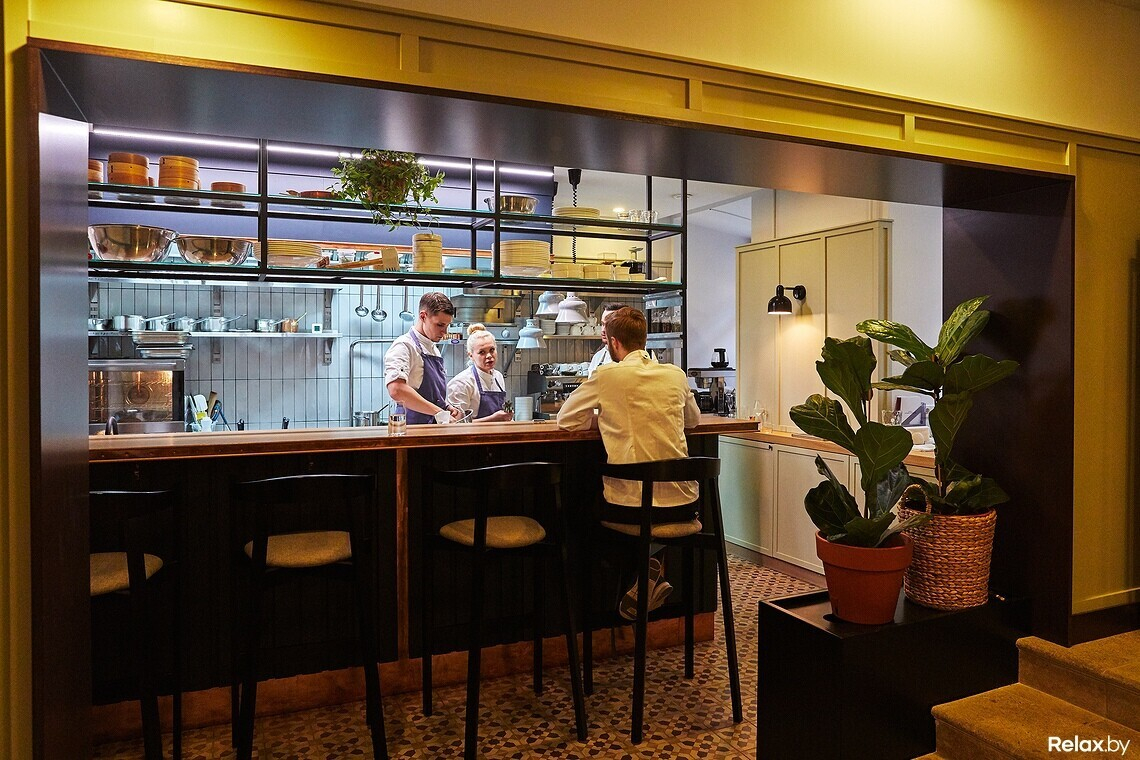 Ресторан разделен на два зала и pre-dining зону — место на открытой кухне за стойкой, где можно наблюдать за приготовлением блюд. Общее количество посадочных мест — 32, в ближайшие недели откроется терраса на 40 мест.