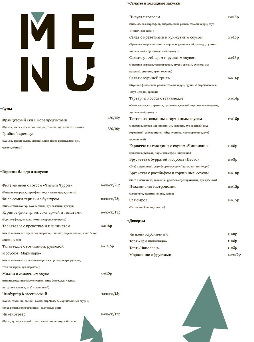 Александра рассказывает: главной задачей было создать что-то простое, но в то же время вкусное. Получилось или нет, решать гостям. Тем не менее, меню вышло максимально полным. Так, заказать можно салаты и холодные закуски — от 8 рублей, супы — от 10 рублей, горячие блюда — 12-25 рублей — их позиции максимально разнообразны по вкусовым предпочтениям: тальятелле, бургеры, мидии в сливочном соусе, мясо и рыба.