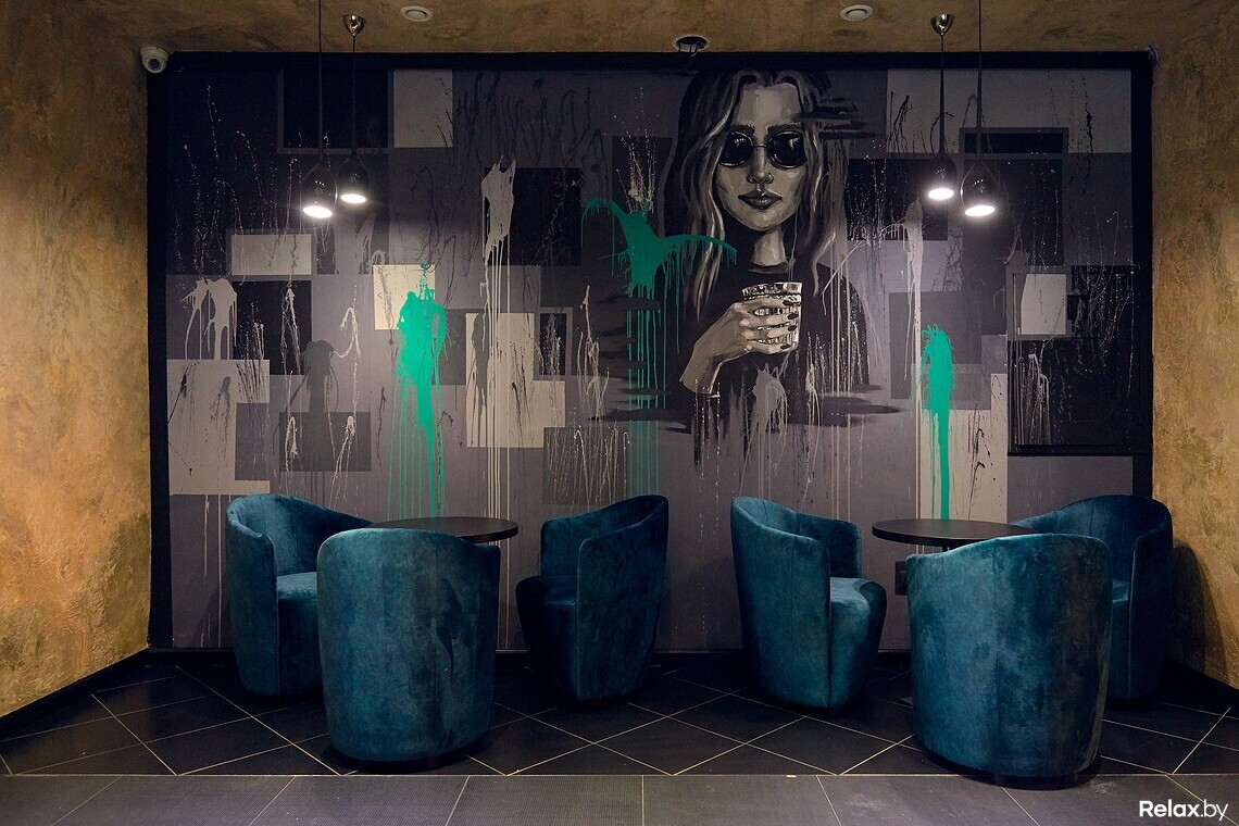 Помещение бара разделено на две зоны: основной зал и VIP. Дизайном занимались сами, рисунки же на стенах, в том числе тот, что встретит вас при входе, выполнила художница-любитель.