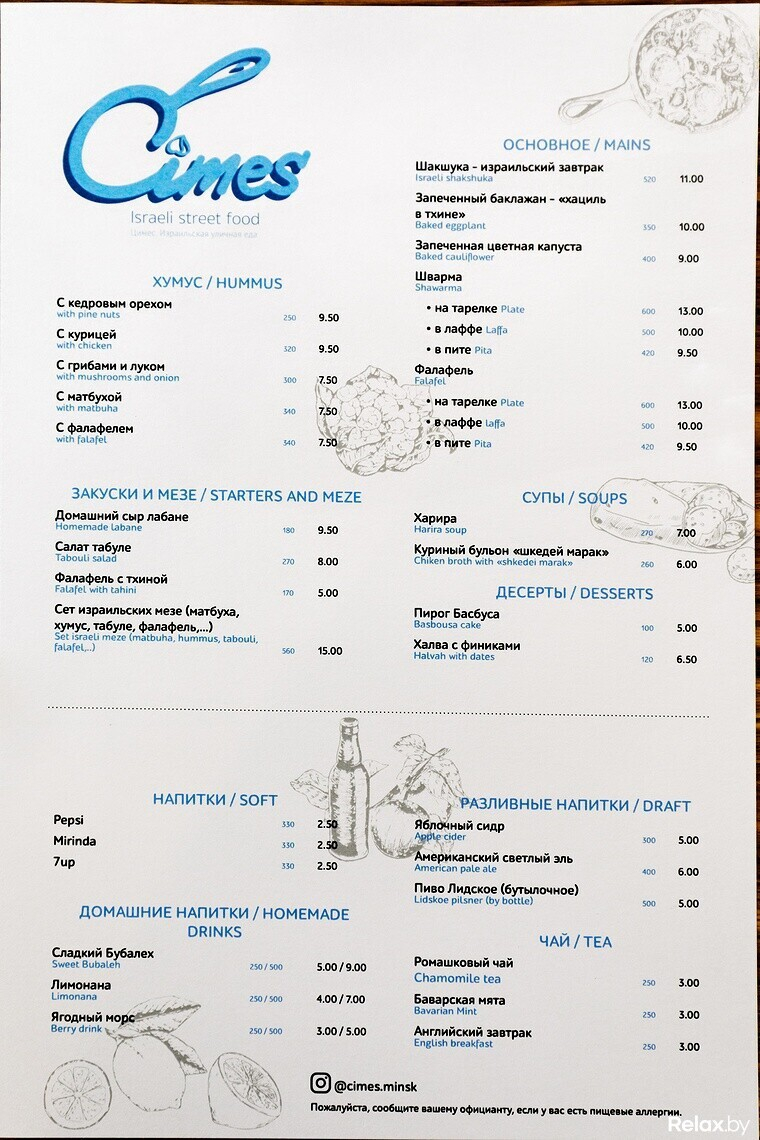 К улице Карла Маркса возвращается былая гастрономическая слава: изжившие себя заведения сменяются амбициозными новичками. Среди последних — Cimes («Цимес»), созданный молодой владелицей Валерией Суровцевой. Девушка вдохновилась известными питерскими проектами и удачно воплотила в Минске идею израильского стритфуда.