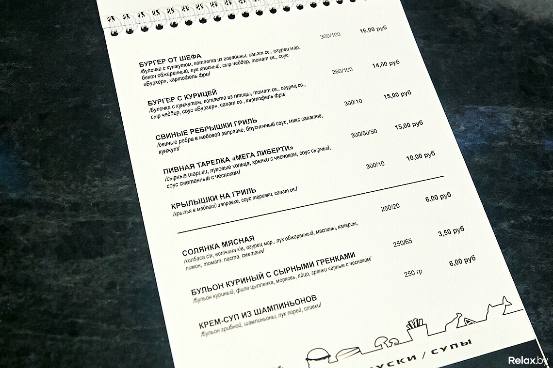 В меню «Денви» бар вы найдете не только блюда европейской и белорусской кухни, но и закуски к пиву и другим крепким алкогольным напиткам. Здесь есть разные виды салатов: греческий — 8,5 руб., цезарь классический — 7 руб., с курицей — 11 руб., с семгой — 16 руб., ассорти из брускетт, мяса, овощей и фруктов — от 8 до 18 руб., закуска под водку — 7 руб., карпаччо из говядины — 15 руб., а также бургеры за 14-16 руб, пивная тарелка — 15 руб., куриные крылышки гриль — 10 руб., стейк из говядины — 20 руб., филе цыпленка — 9 руб., свиная корейка — 9 руб., картофель фри — 2,50 руб., шампиньоны гриль — 7,50 руб. Соусы — 1-1,7 руб.
