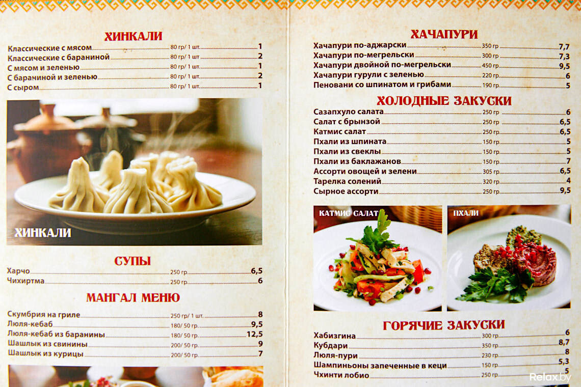 Блюда в заведении понятные, но в то же время сытные — за это спасибо украинскому бренд-шефу «Хинкальни» Левану Мепаришвили. Твердыня или основа основ грузинского ресторана — хинкали. Заказать их можно традиционно от 1 рубля за штуку. Хачапури предлагают от 6 рублей, холодные и горячие закуски — от 5 рублей, блюда с мангала — от 7 рублей. Супы, в том числе хорошо знакомый многим харчо, — от 6 рублей за порцию, а десерты — от 2 рублей. Традиционный грузинский хлеб шоти подают за 2 рубля (200 граммов).