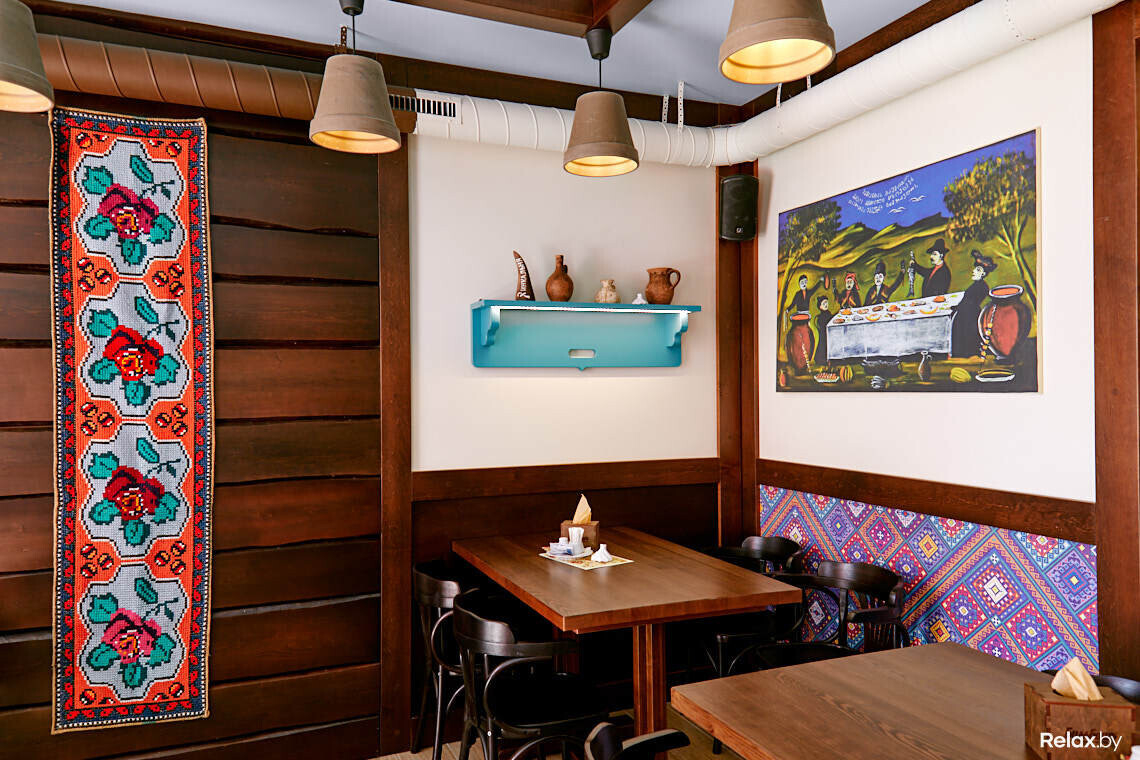 Оформление «Хинкальни» узнаваемо. В основе фирменного стиля — старинный узор грузинской вышивки, темно-коричневая деревянная мебель, картины на стенах.