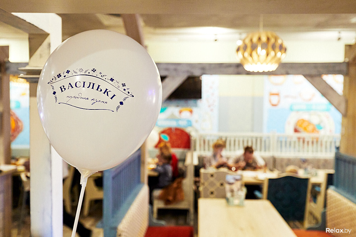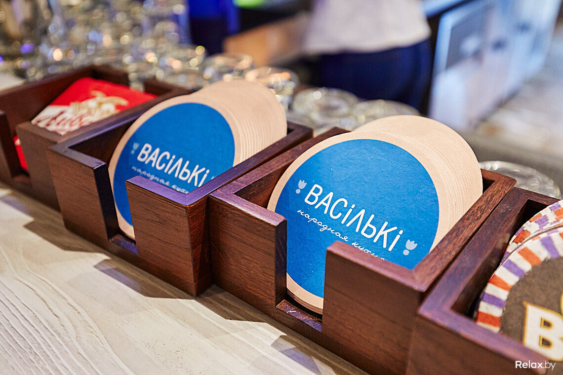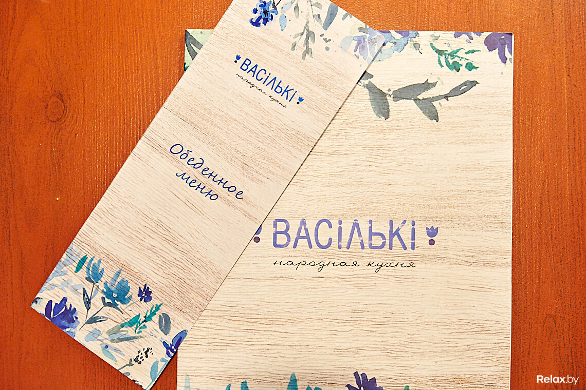 Меню будет хорошо знакомо гостям. Заказать можно драники с разными начинками, пельмени и вареники ручной лепки, горячие блюда в сковородках, блюда из мяса и рыбы. Из напитков в заведении предлагают настойки, наливки и квасы собственного приготовления. С 12:00 до 16:00 в будни в ресторане народной кухни «Васiлькi» действует обеденное меню. Стоимость комплекса из трех блюд — 9,70 рубля.