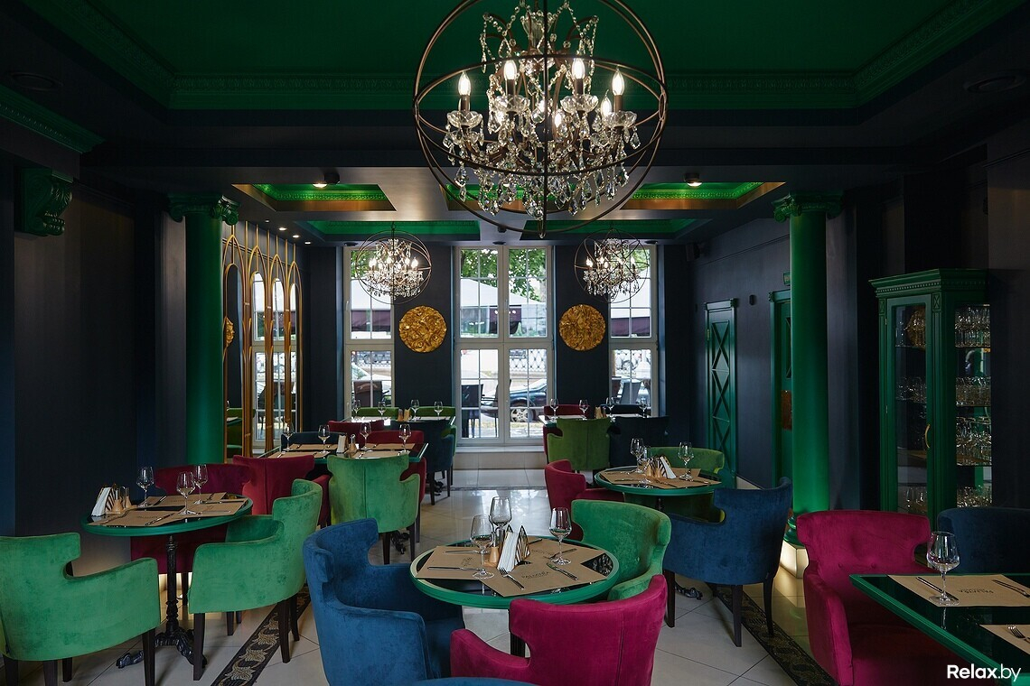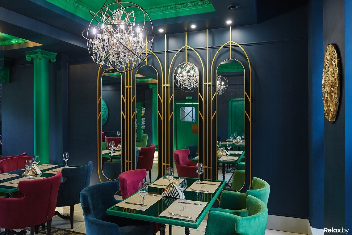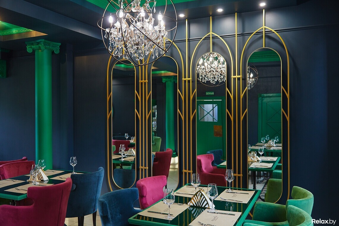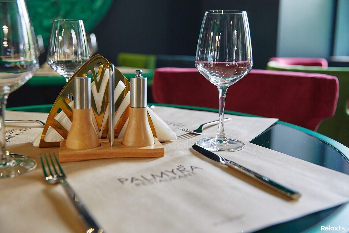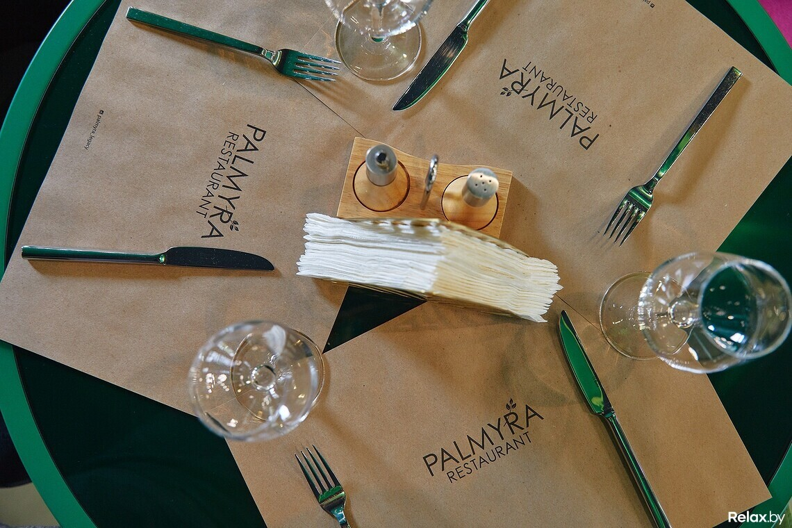 Пальмиру называли «городом пальм», поэтому ключевой цвет в отделке — зеленый в контрасте с фуксией и глубоким синим. Вместимость зала — около 40 гостей, еще 20 могут разместиться на летней террасе.