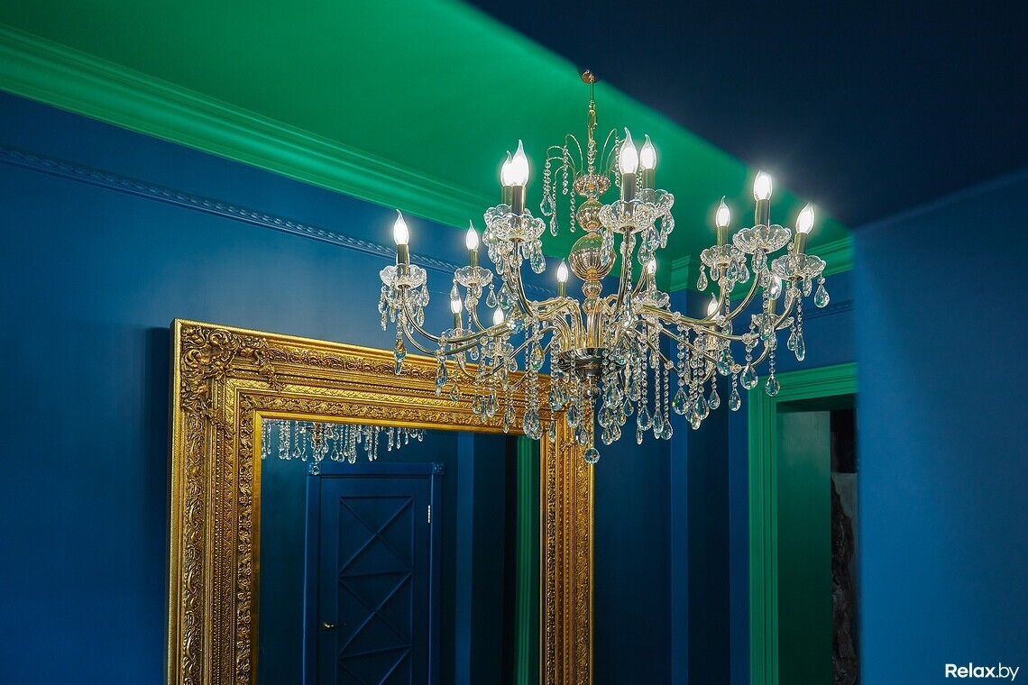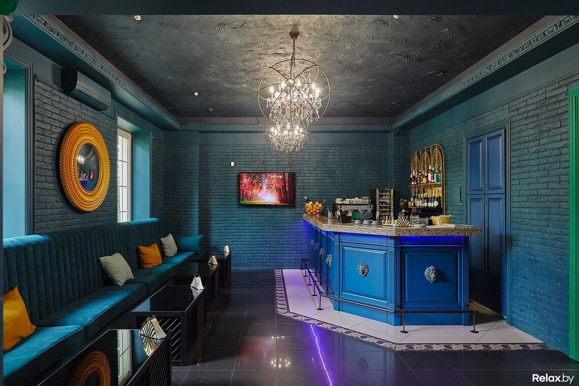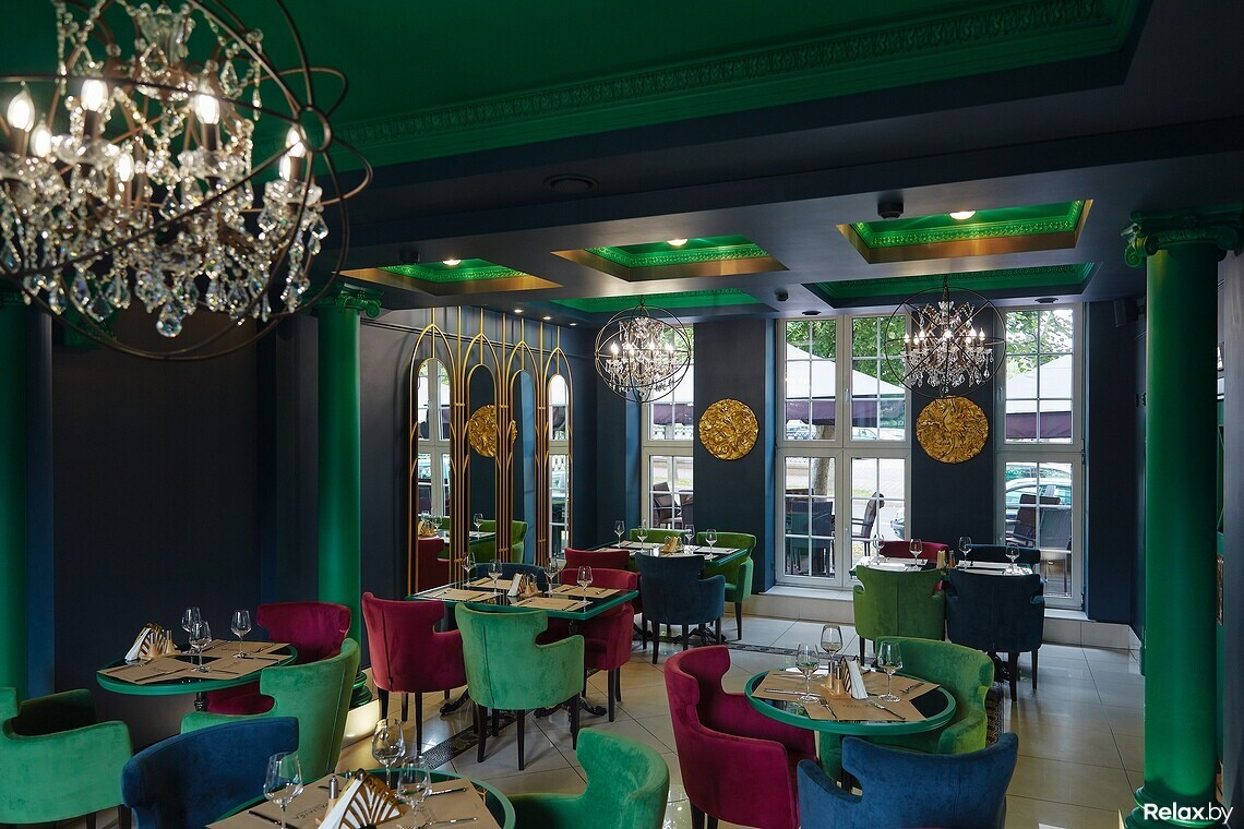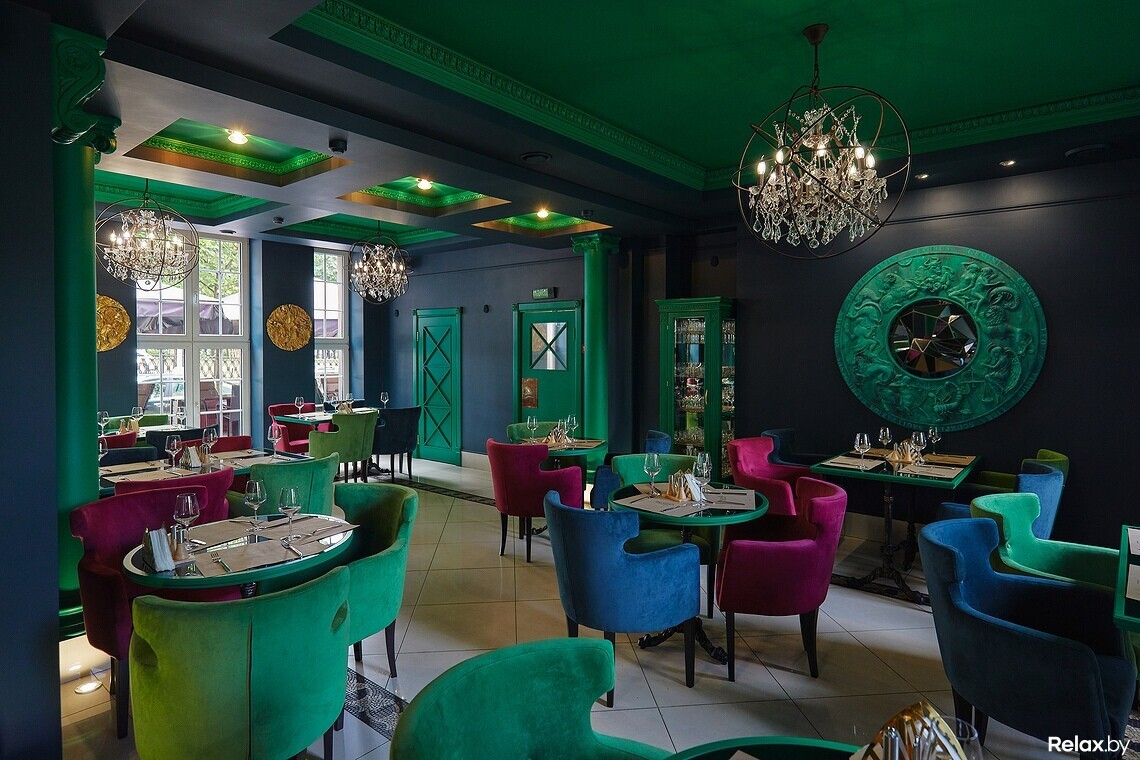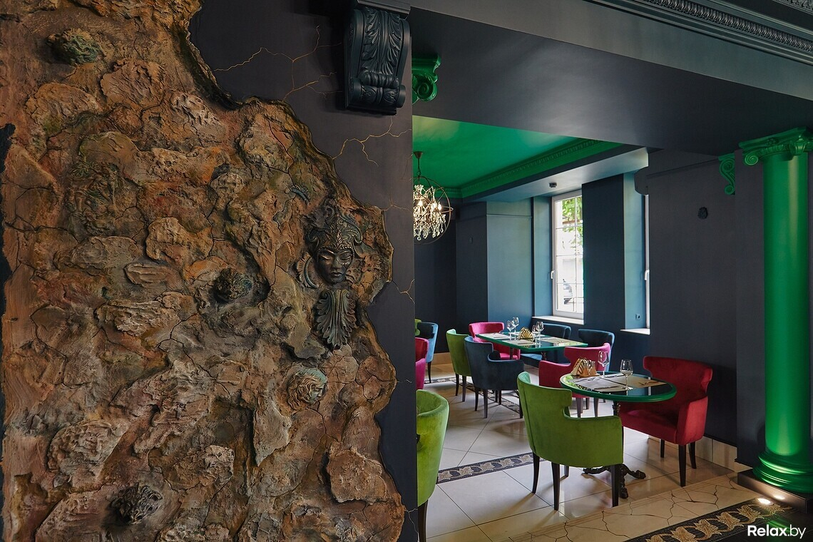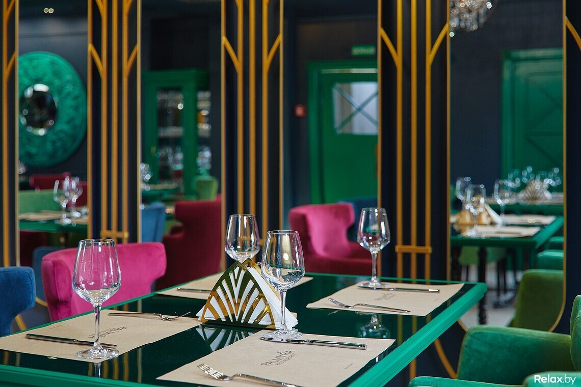 Пальмиру называли «городом пальм», поэтому ключевой цвет в отделке — зеленый в контрасте с фуксией и глубоким синим. Вместимость зала — около 40 гостей, еще 20 могут разместиться на летней террасе.
