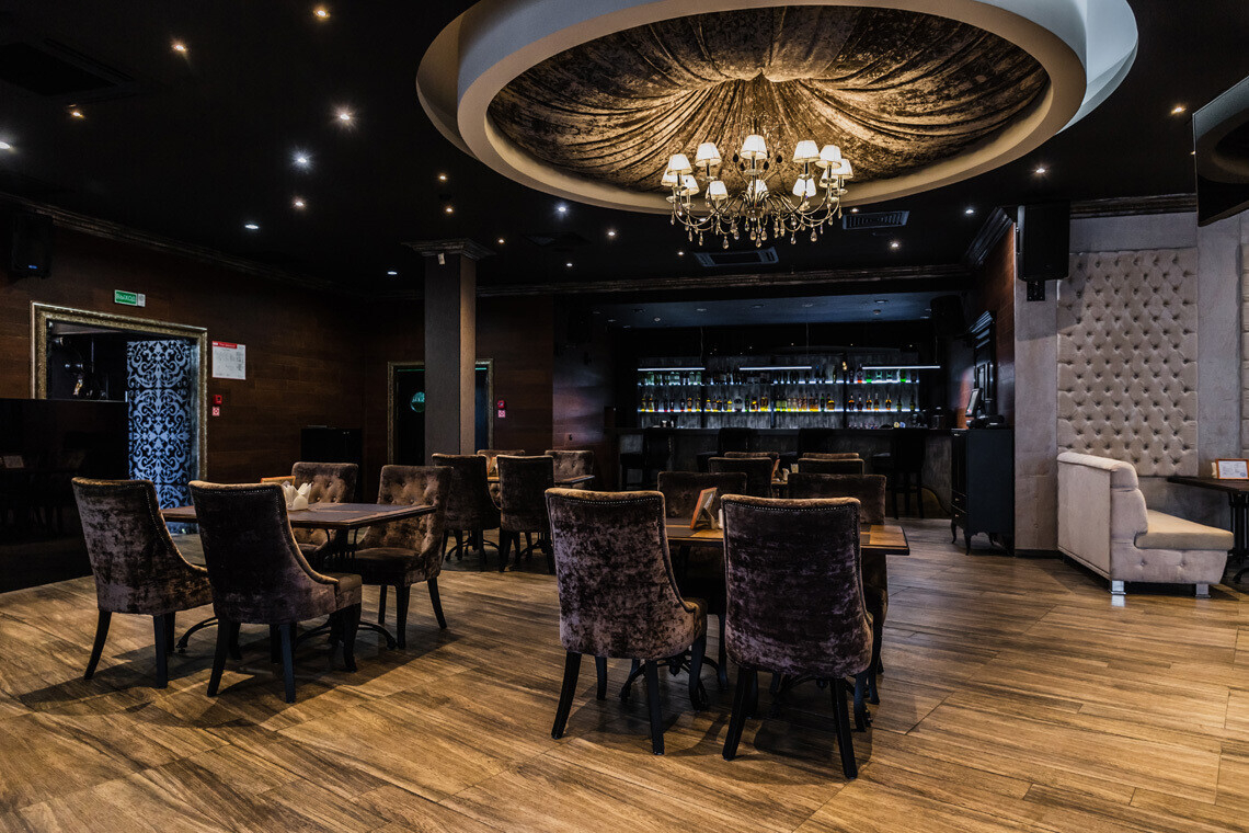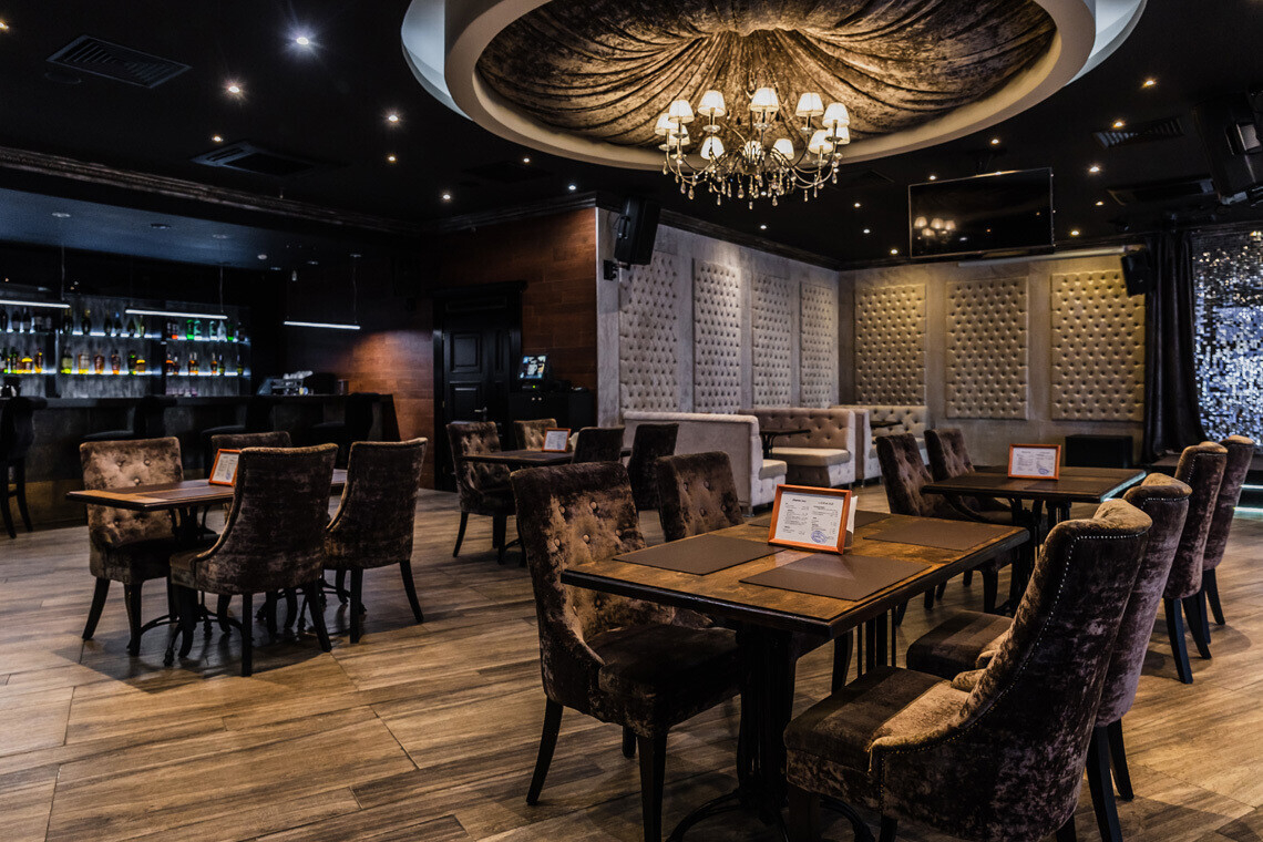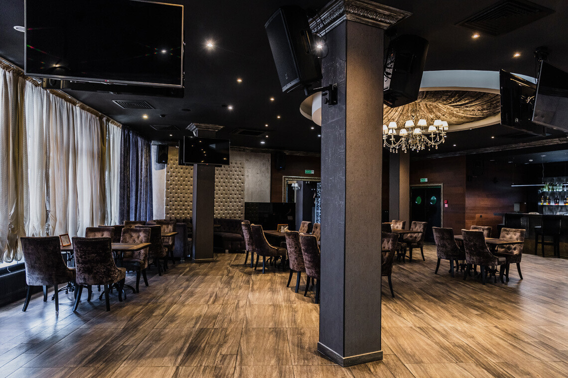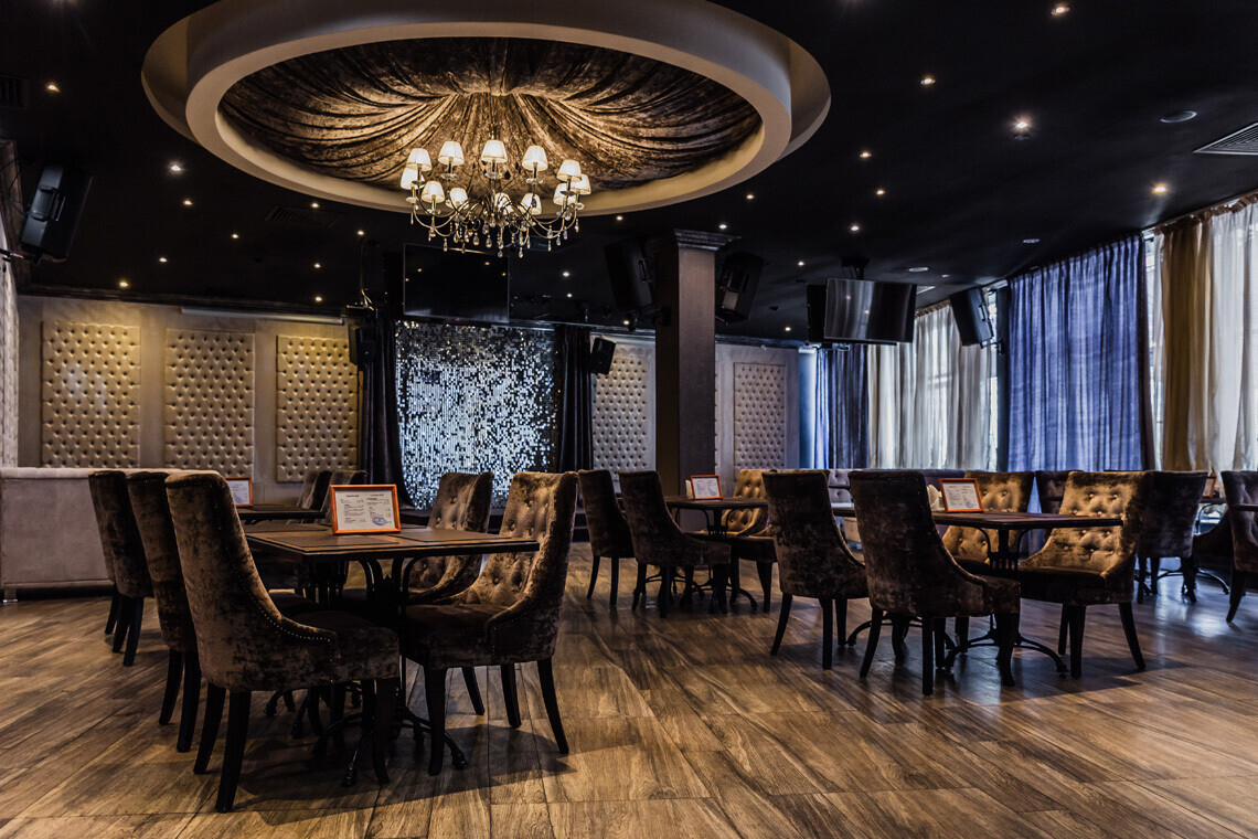В основе дизайна интерьера «Медвежино» — нестареющая классика. В качестве отделочных материалов зала ставку сделали на дерево и бархат. Однако то, что, бесспорно, притягивает взгляды — сцена для караоке, оформленная зеркальными светоотражающими элементами.