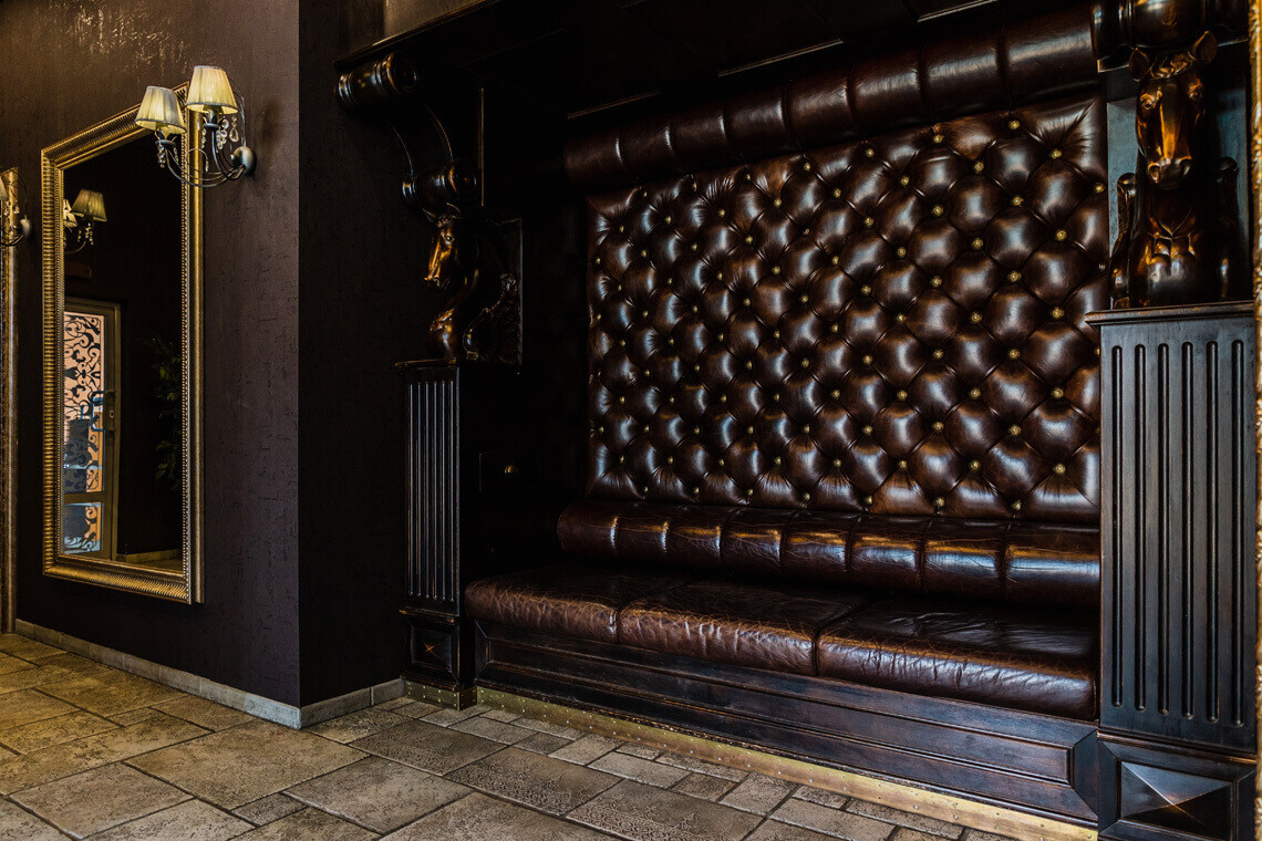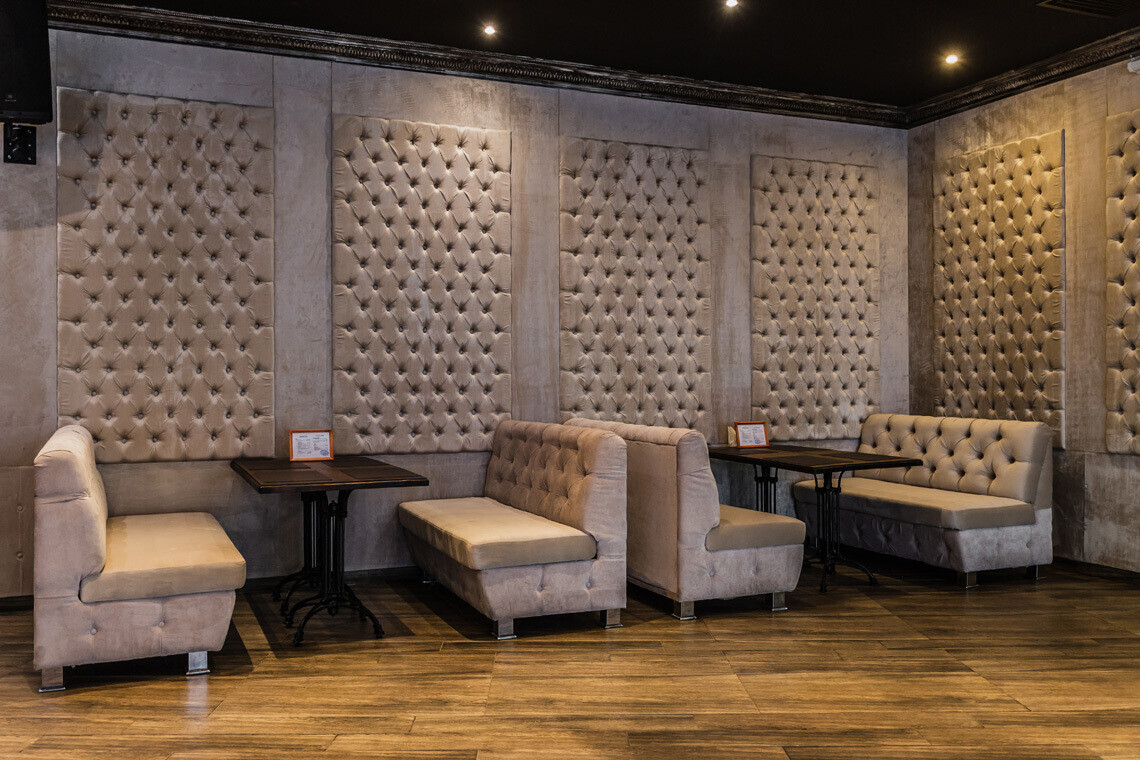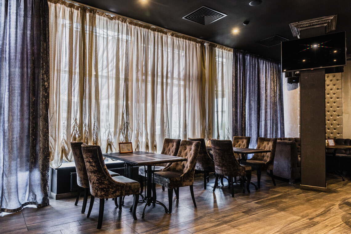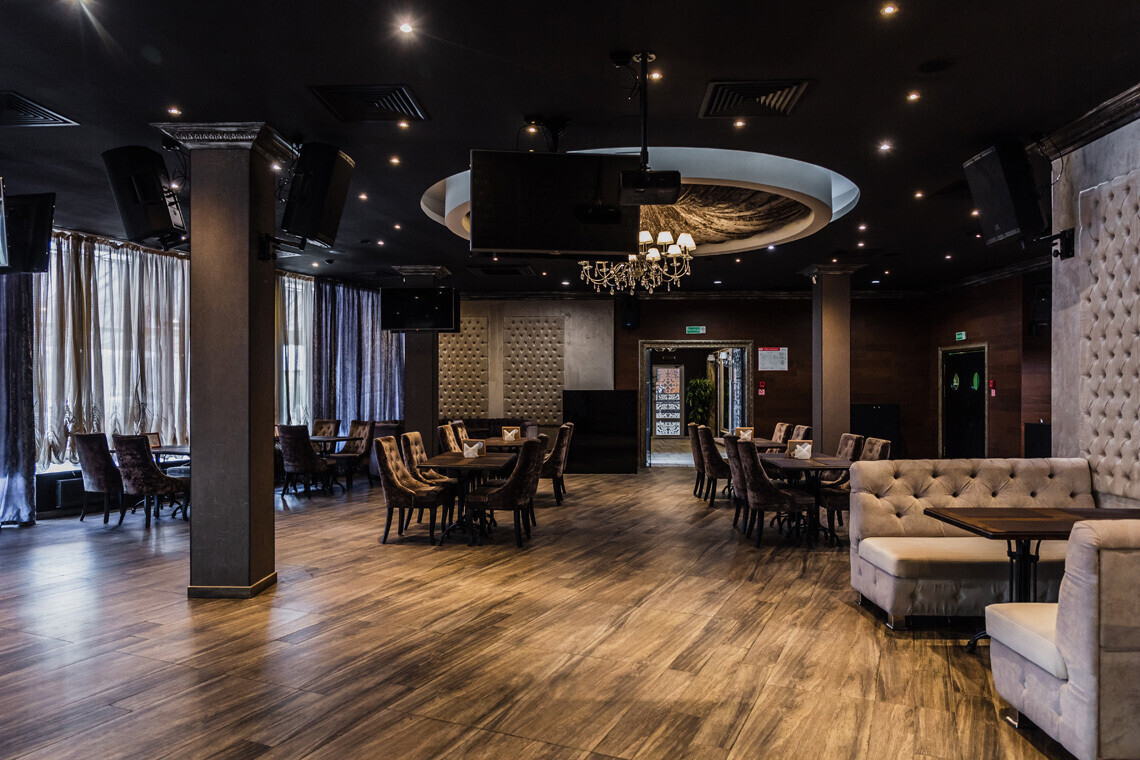 В основе дизайна интерьера «Медвежино» — нестареющая классика. В качестве отделочных материалов зала ставку сделали на дерево и бархат. Однако то, что, бесспорно, притягивает взгляды — сцена для караоке, оформленная зеркальными светоотражающими элементами.