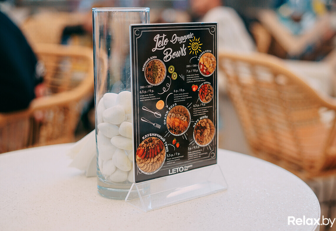Меню в Leto Organic Bar обновляется 2-3 раза в год. Команда сети постоянно работает над поиском новых сочетаний, кроме того, все позиции в меню тщательно прорабатываются вместе с диетологами для того, чтобы максимально соответствовать концепции заведения.