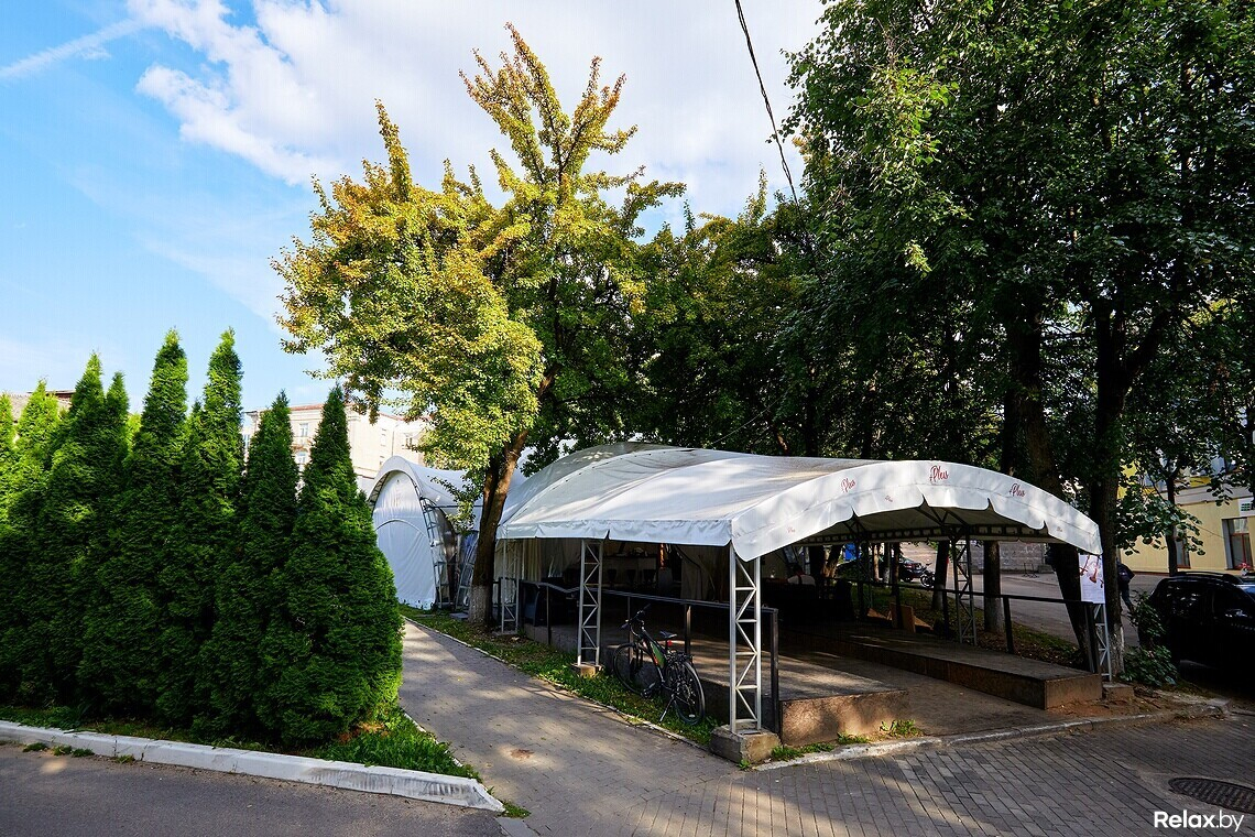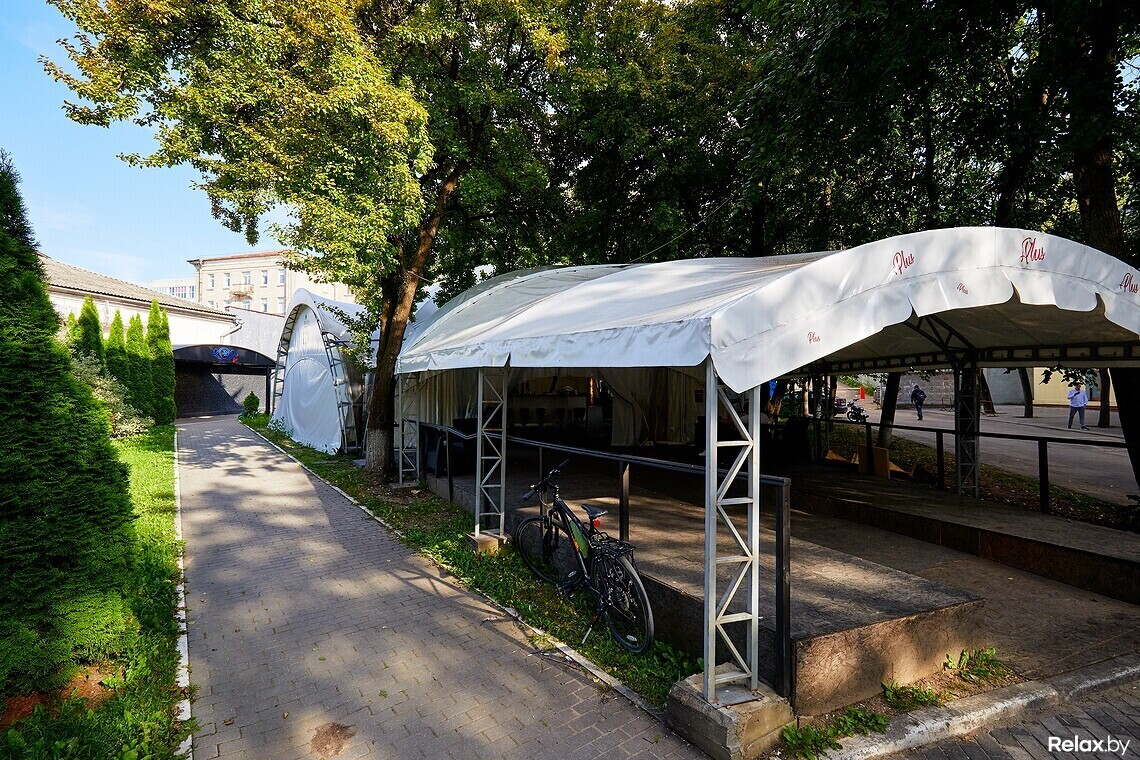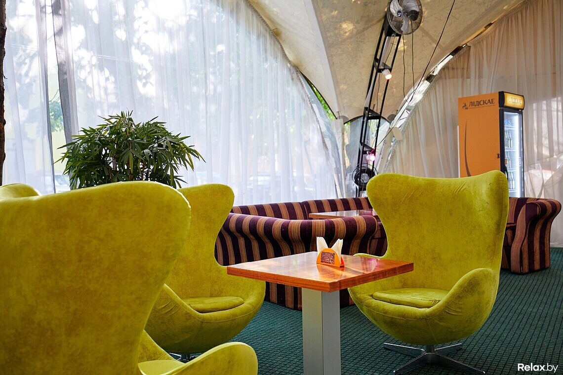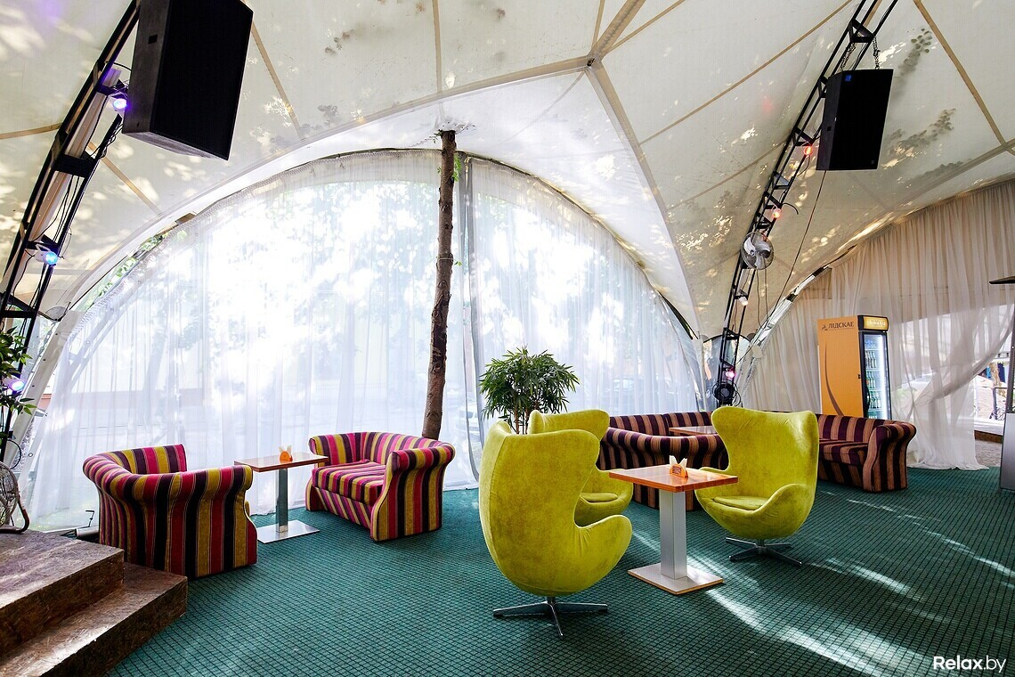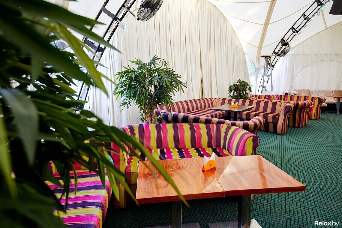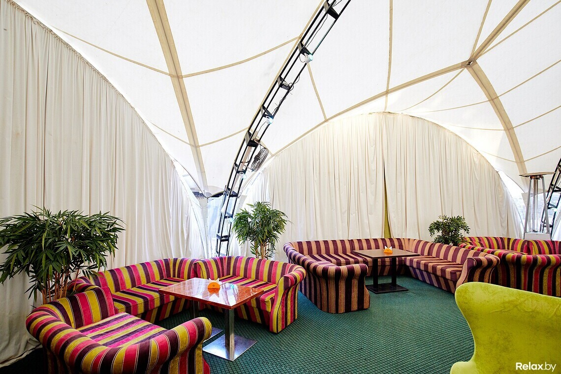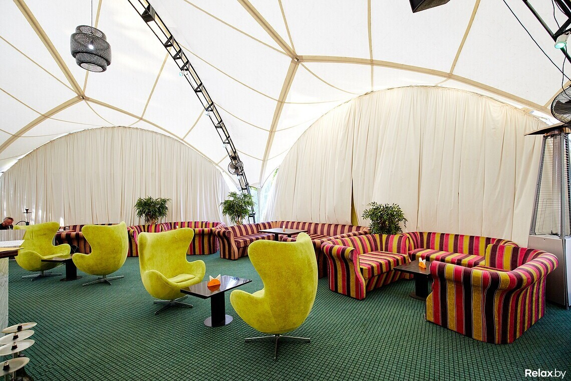 Терраса удачно расположена в гуще деревьев, скрытая от глаз случайных прохожих. Внутри, под навесом, установлена сцена с аппаратурой, контактная барная стойка в центре пространства «шатра», а вокруг — места для гостей за столиками с расположенными рядом яркими диванами и креслами.