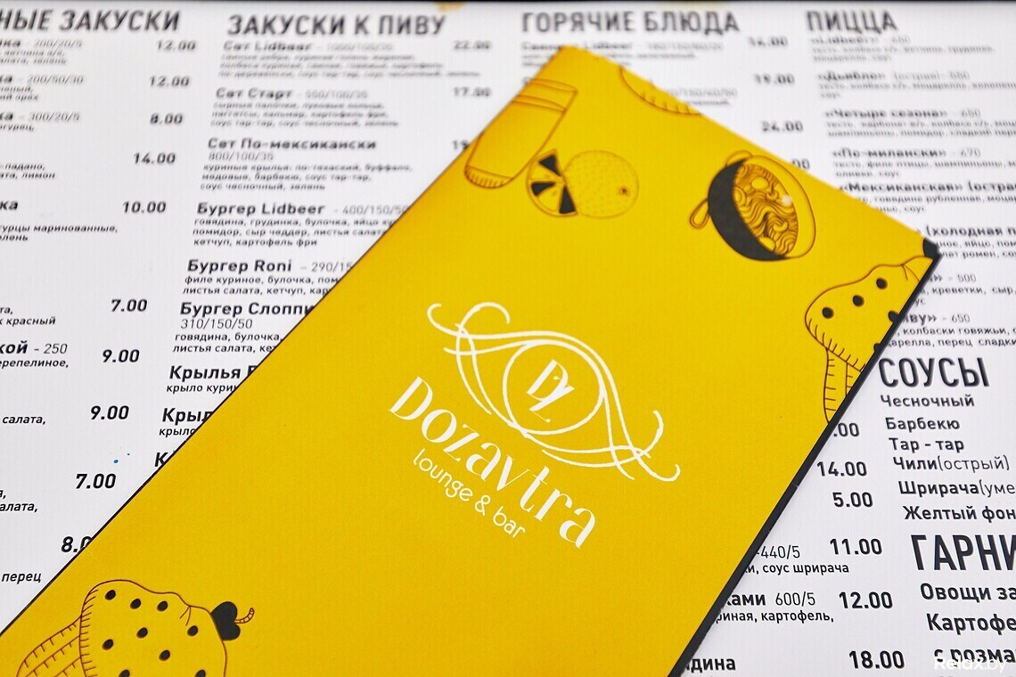 Собственной кухни в DoZavtra нет: заведение работает в коллаборации с LidBeer, поэтому приготовление блюд лежит на шефе бара. Иван подчеркивает, что работа с ними позволяет делать очень приятную цену на пиво и меню.