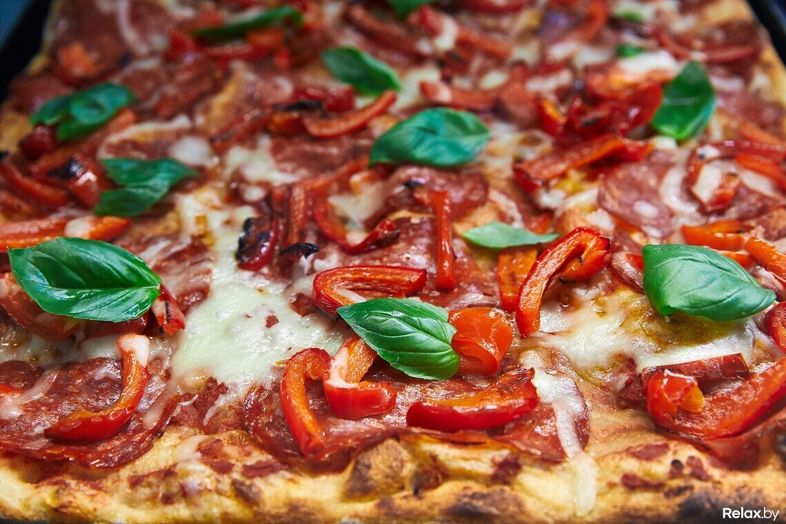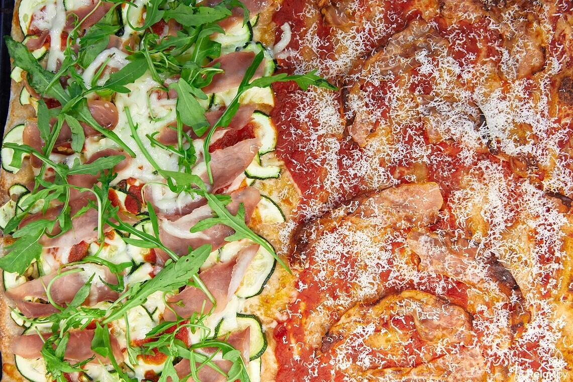 На одном противне помещается сразу два вида начинок пиццы телия: так гости смогут попробовать разные вкусы, заказав несколько кусочков.
