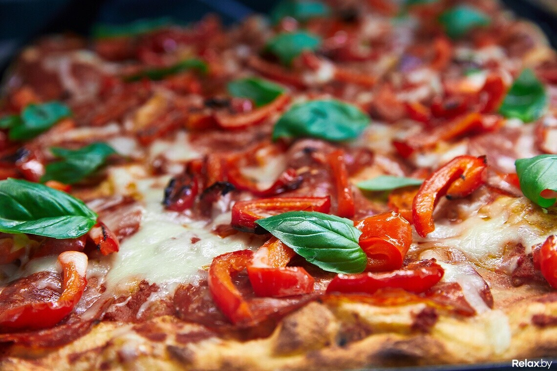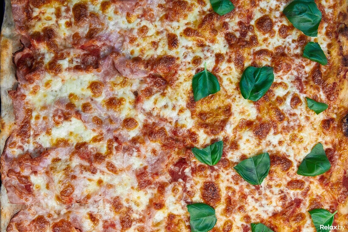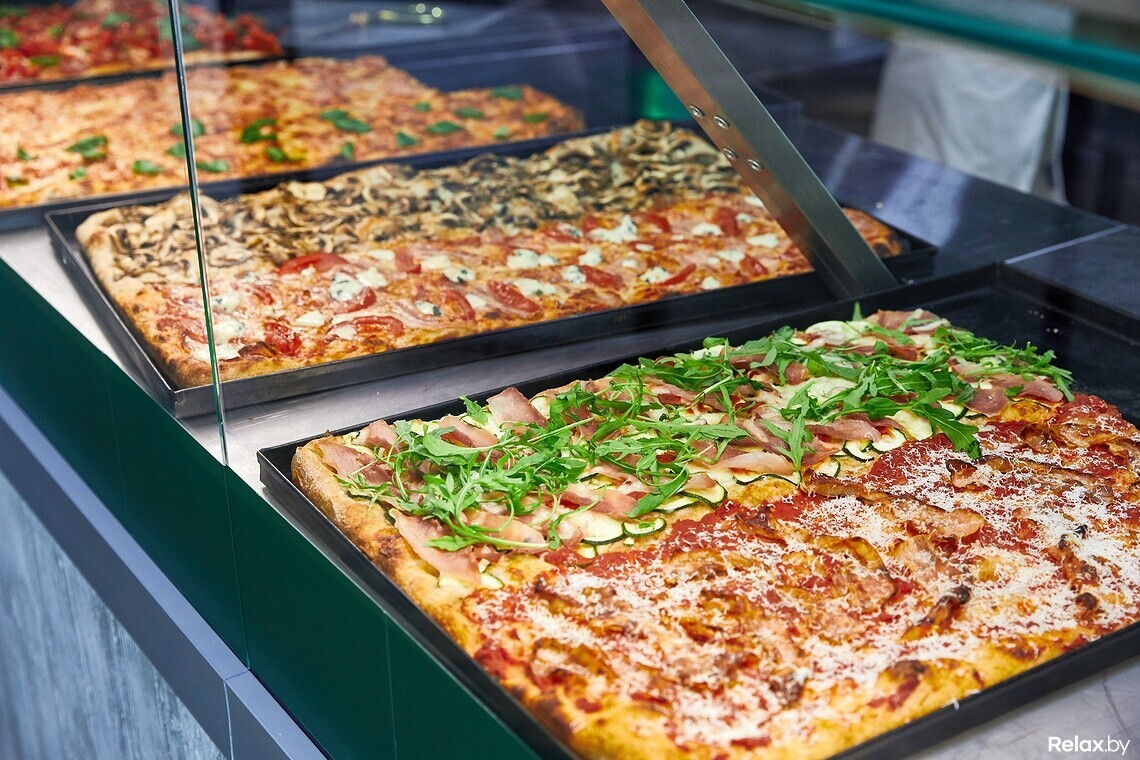 Римская пицца отличается по весу в зависимости от начинки: например, полоска грибной будет более узкой, чем маргарита или пепперони. Цены начинаются с 2,4 до 2,8 рубля за 100 граммов.