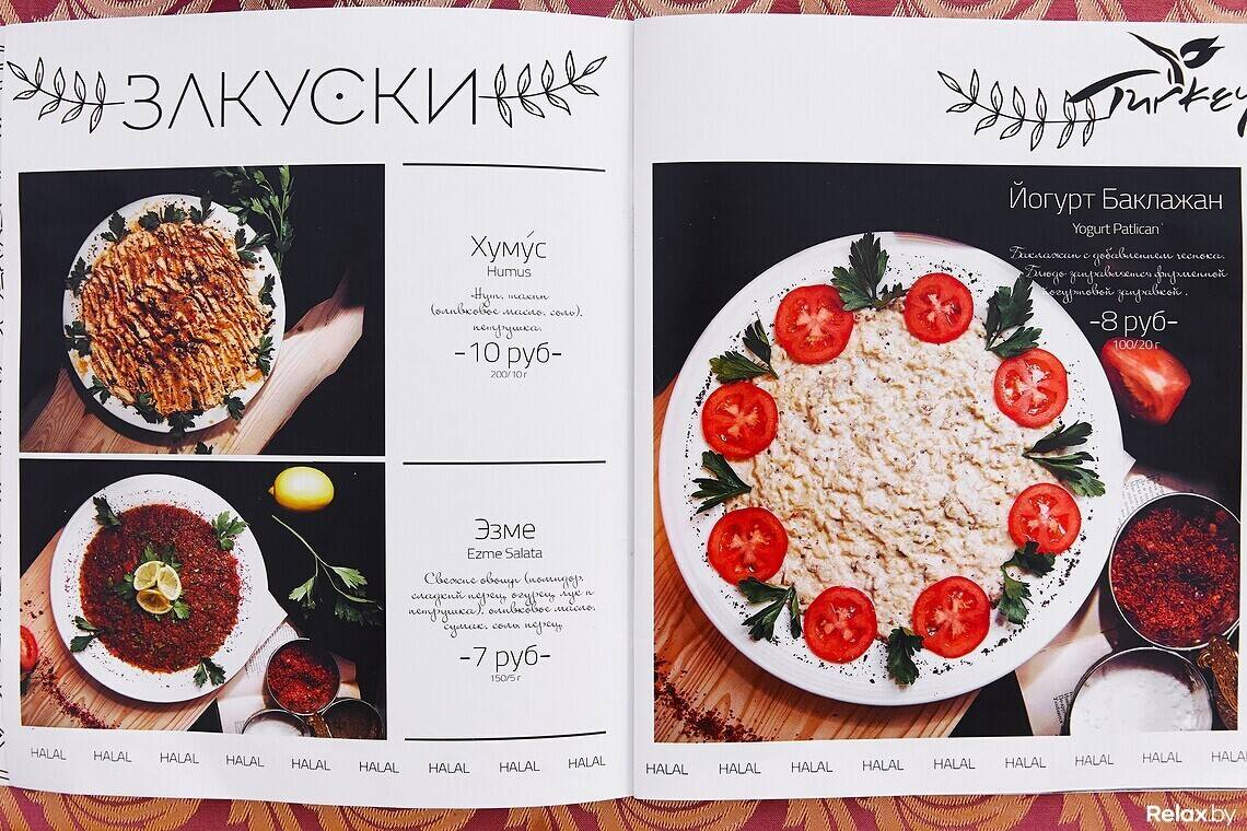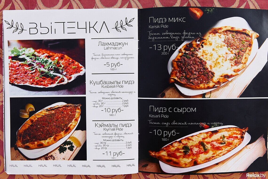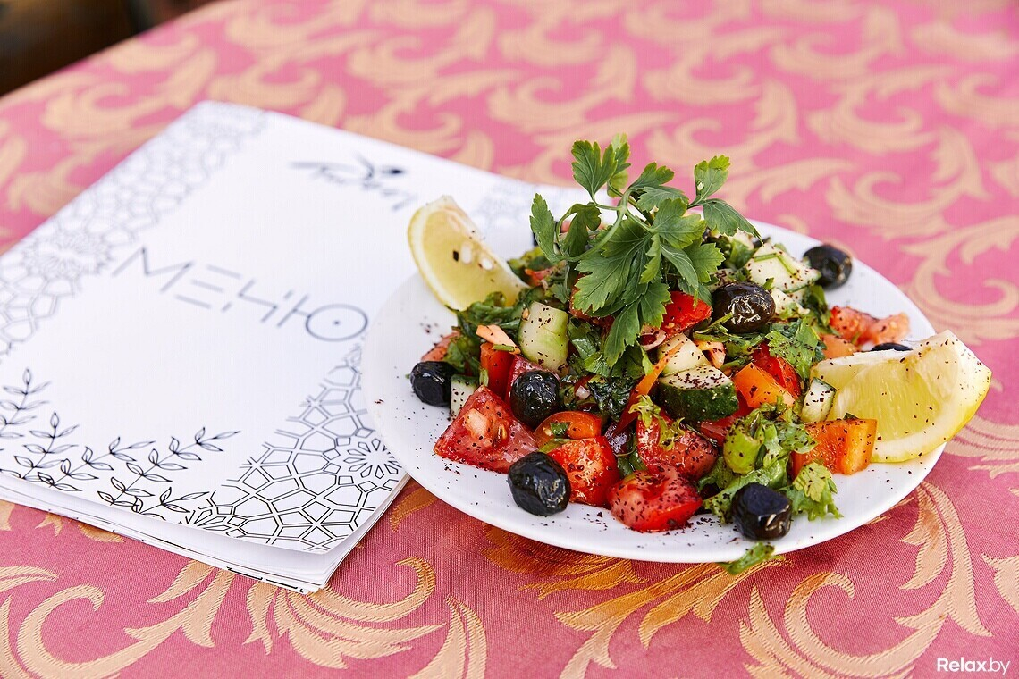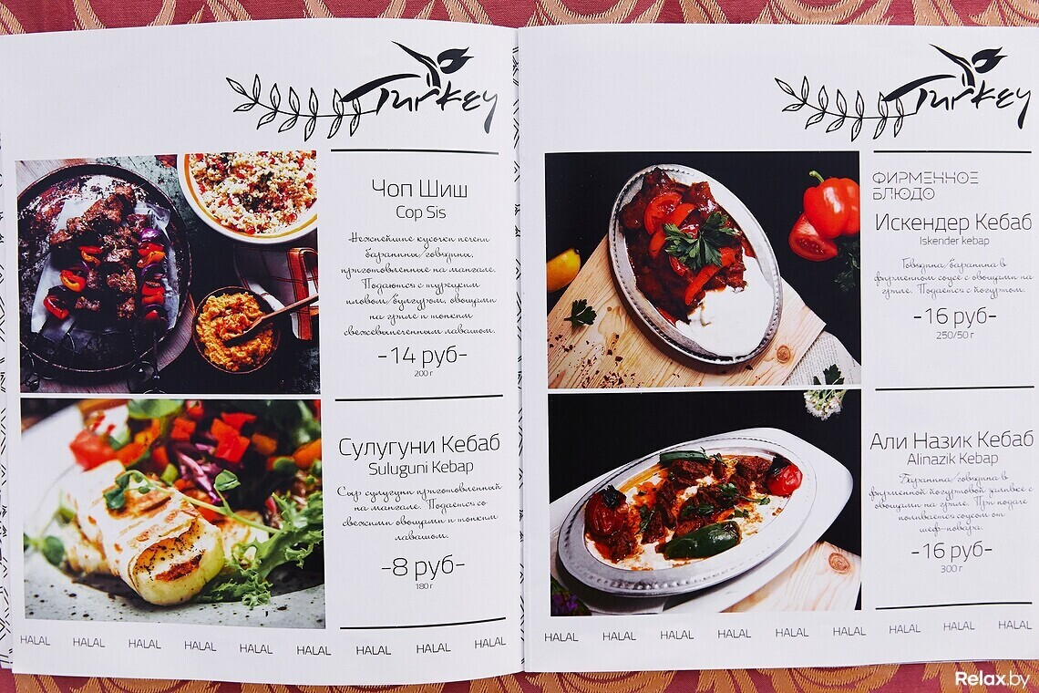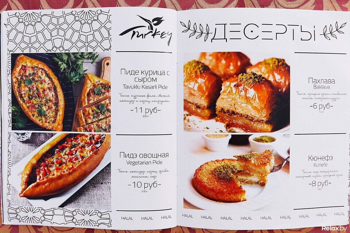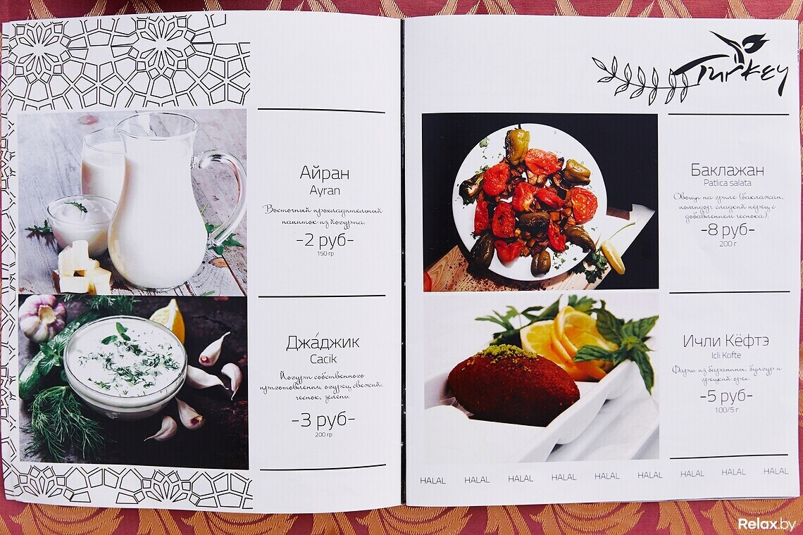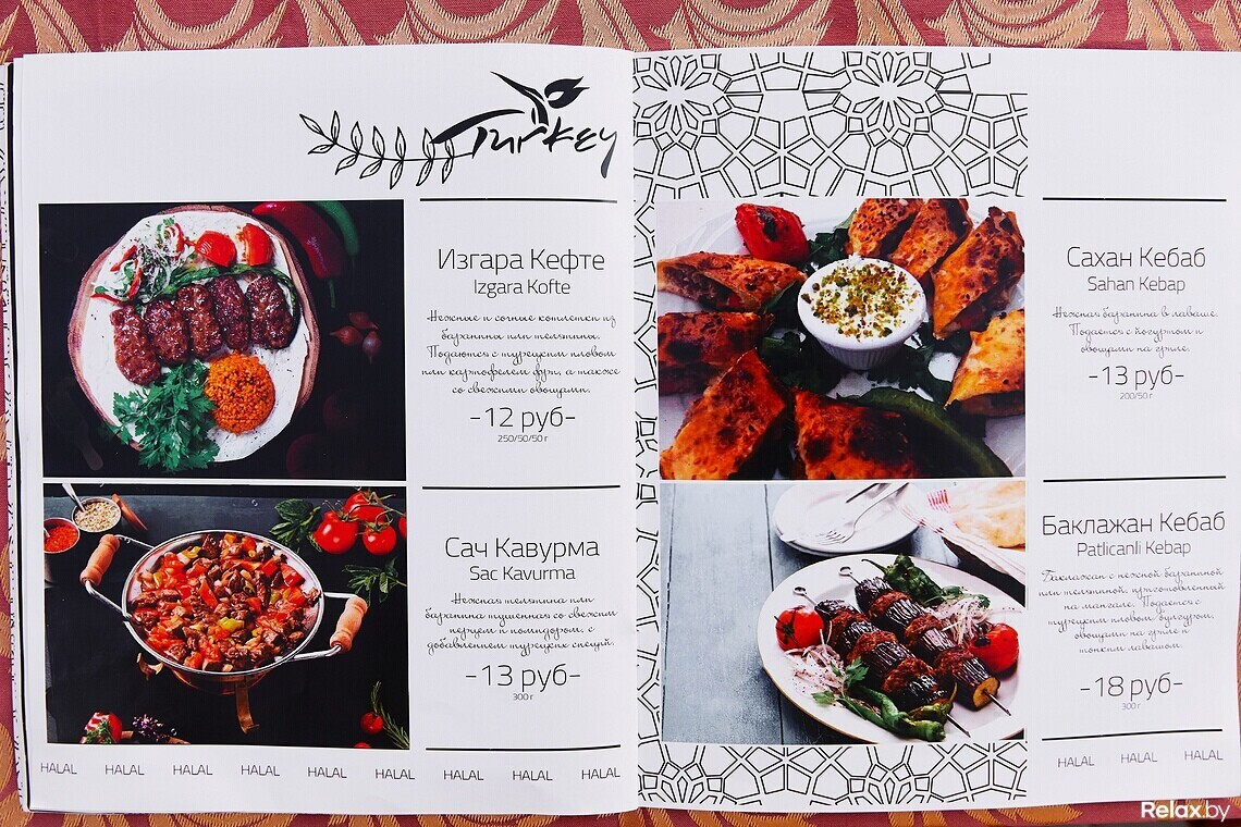 Халяльное мясо шеф-повар нарезает сам, другим поварам не доверяет. В меню не встретите ни свинину, ни мясные полуфабрикаты. Только отборная баранина и птица. Европейских блюд минимум: пара салатов, бургер, бифштекс.