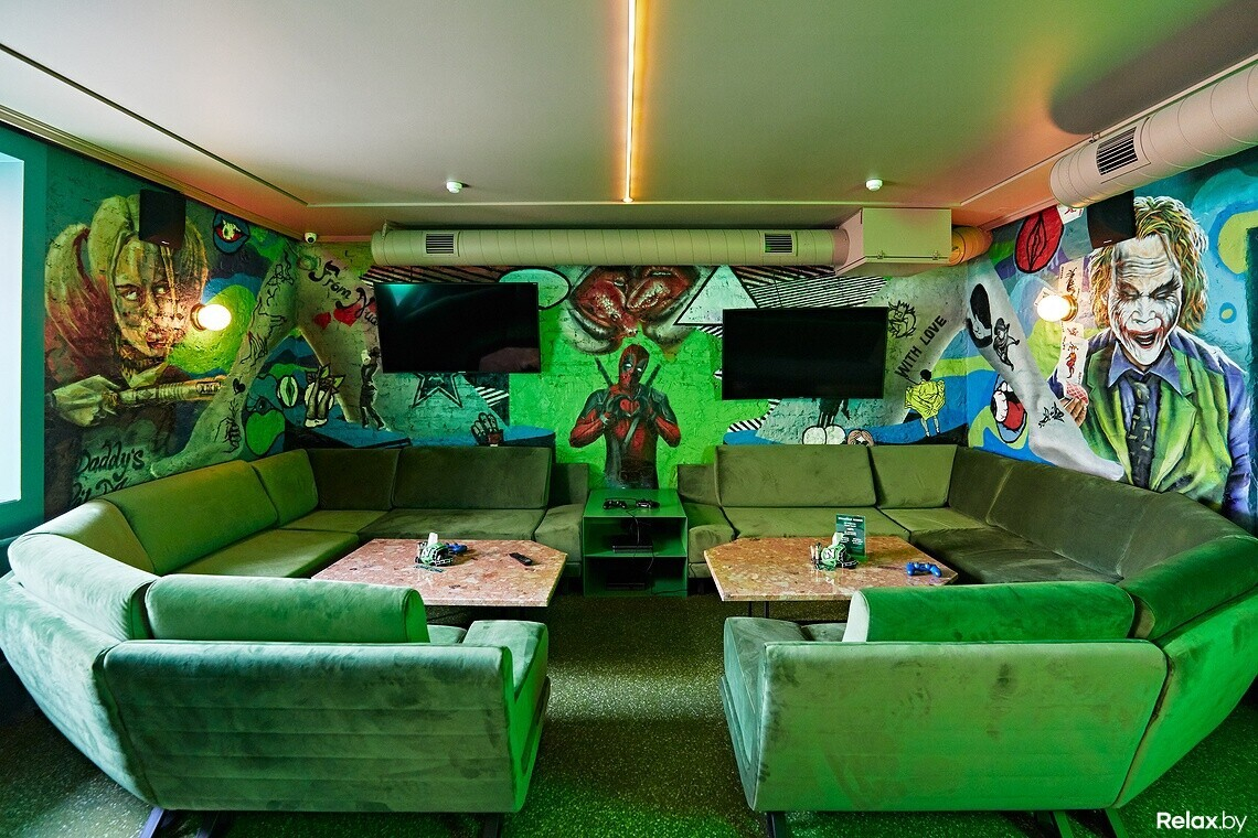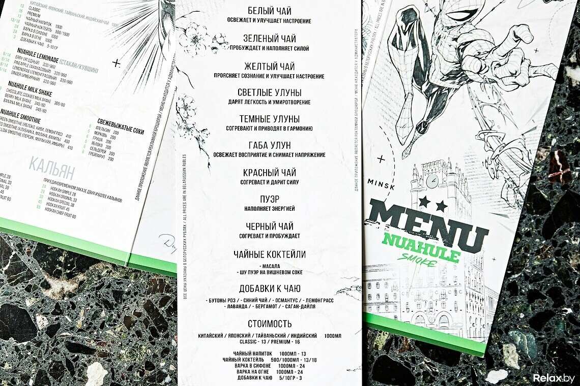 На стенах кальян-бара можно увидеть рисунки с изображением героев комиксов Marvel. Их же использовали при оформлении меню заведения.