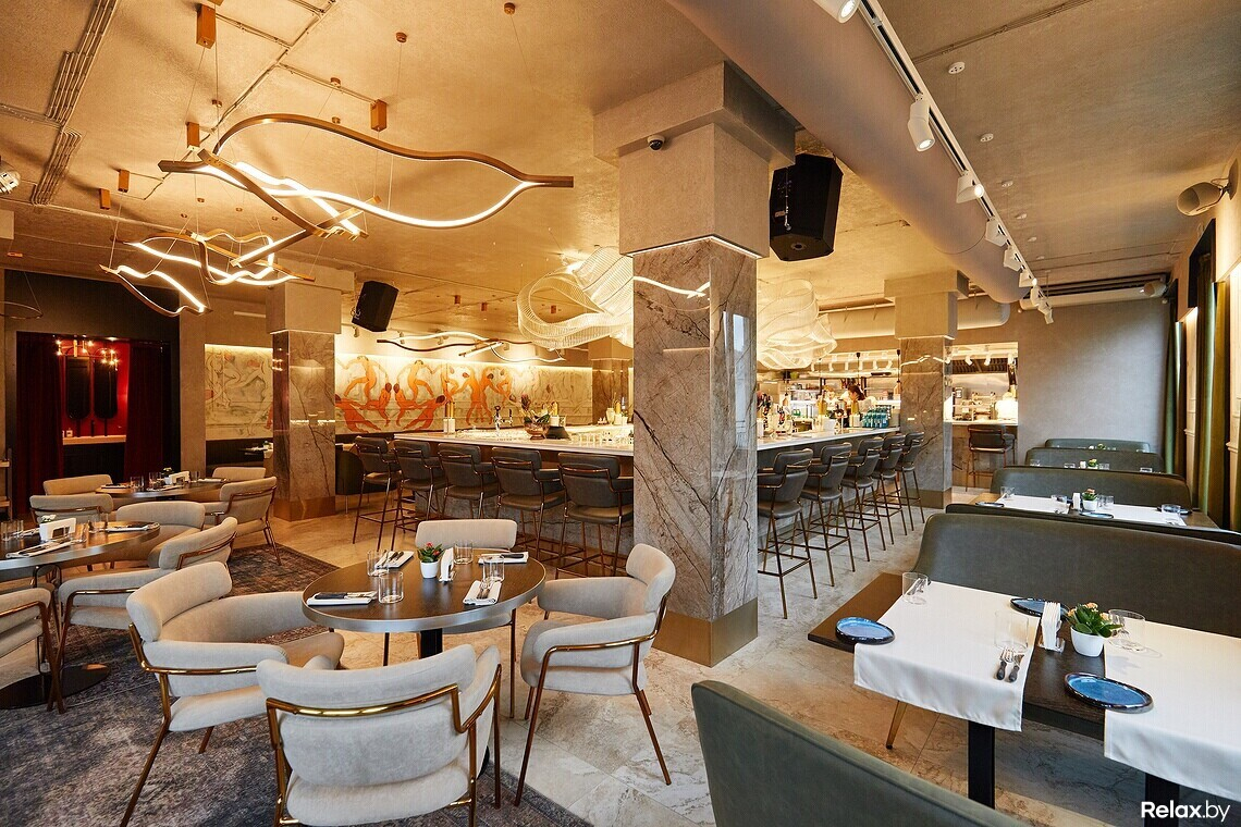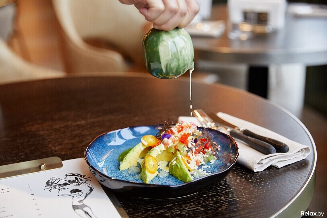 Открытая кухня — еще один ключевой прием в интерьере. Меню космополитично: шеф-повар использует привычные продукты, но нетривиально их интерпретирует. Сочный пример — тартар из форели. Его здесь подают с авокадо, чипсами из кумквата, попкорном из риса и тремя видами икры. Салат с креветками и рукколой дополняют киноа и мороженым из горгонзолы. Тигровые креветки шеф сочетает с клубничным пюре и апельсиновым соусом, а тунец — с арбузом, рукколой и бальзамическим соусом. Блюда гриль готовят на углях в Josper.