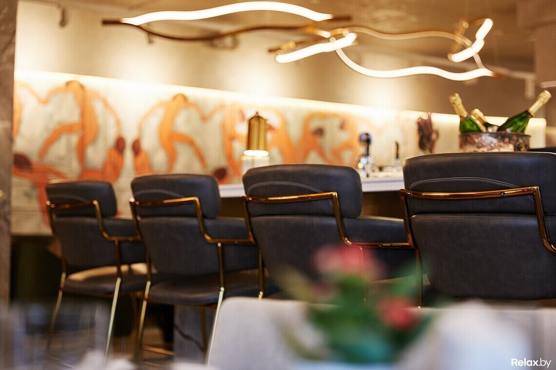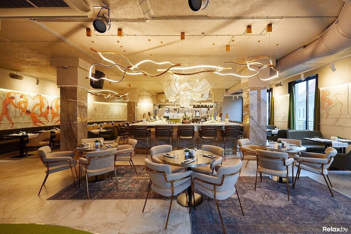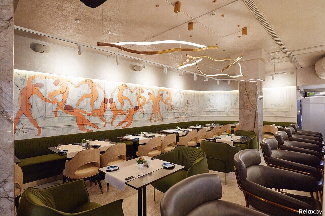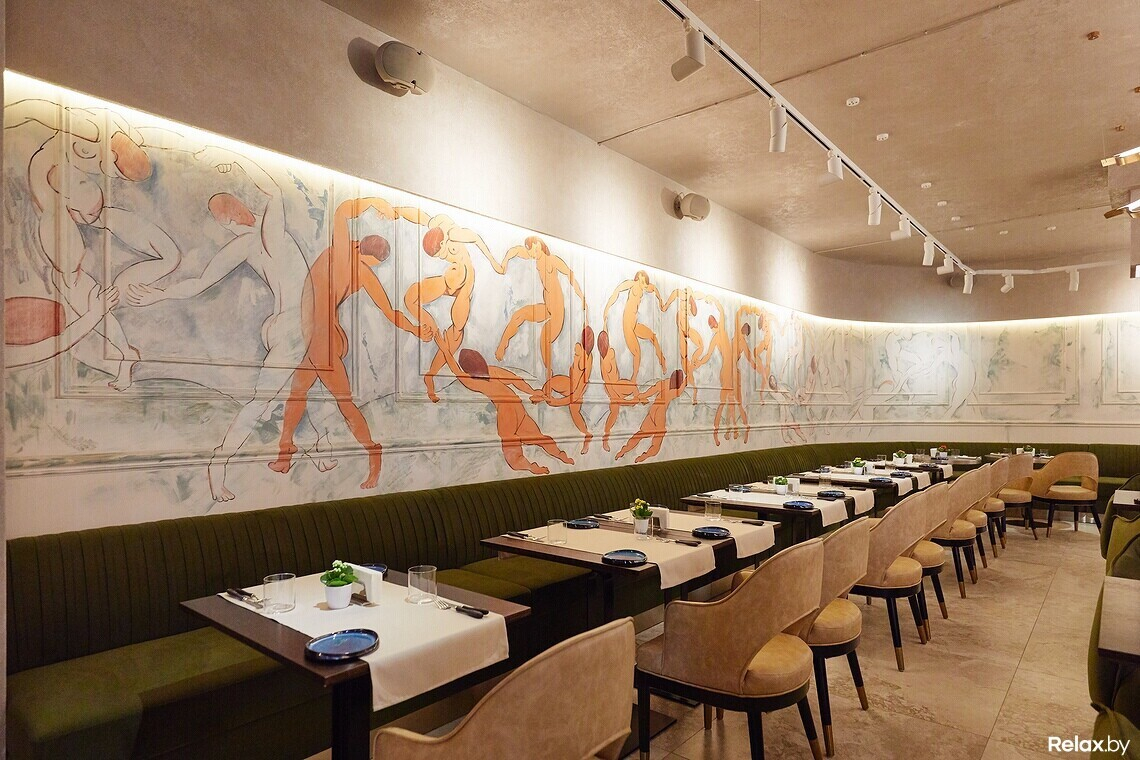 Цветовая гамма сдержанная: цвет играет между оттенками шампань и шартрез. Цепляющий взгляд прием — панно «Танца» Матисса в левой части зала, выполненное поверх гипсовой лепнины. В холле ищите самый узнаваемый знак линчевской стилистики — красные шторы, как грань между реальным и воображаемым. Входную группу украшает постмодернистский торшер, стилизованный под Джакометти. В сервировке официанты и бармены используют антикварные предметы и инвентарь.