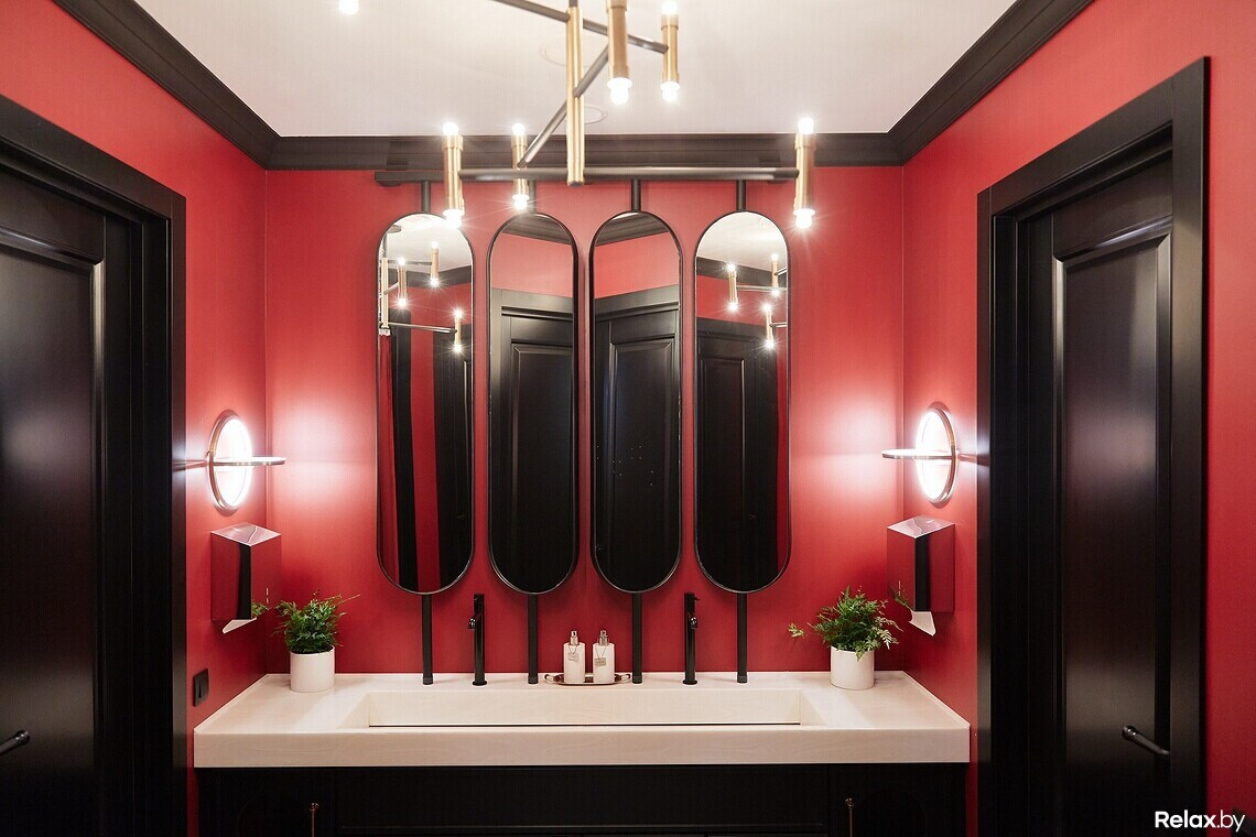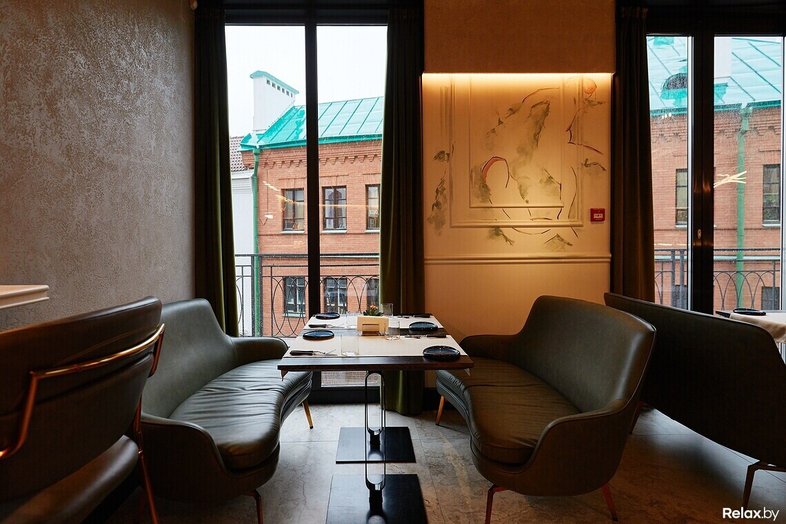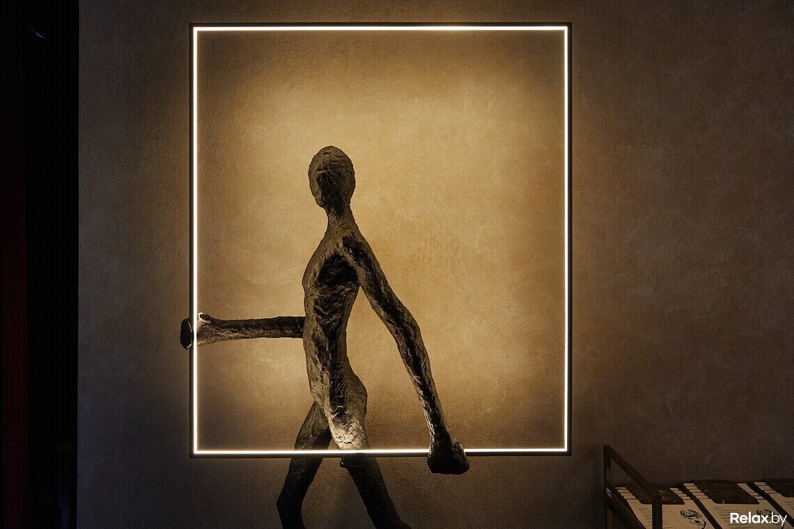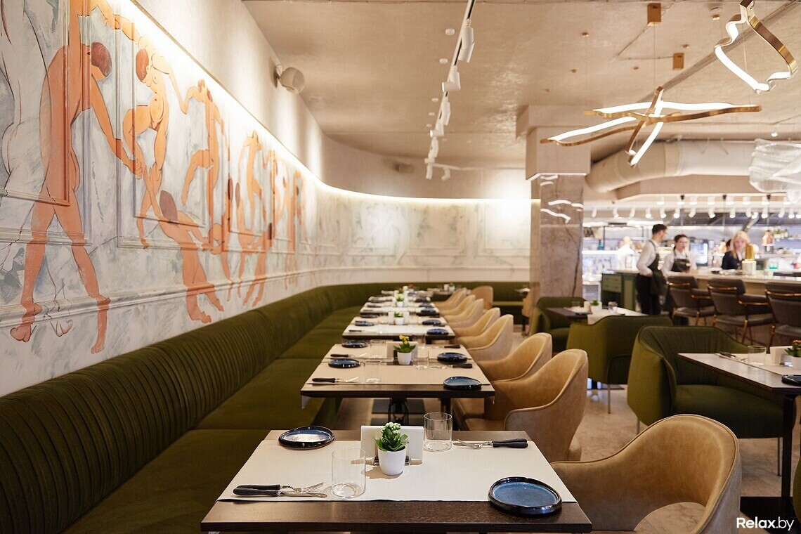 Цветовая гамма сдержанная: цвет играет между оттенками шампань и шартрез. Цепляющий взгляд прием — панно «Танца» Матисса в левой части зала, выполненное поверх гипсовой лепнины. В холле ищите самый узнаваемый знак линчевской стилистики — красные шторы, как грань между реальным и воображаемым. Входную группу украшает постмодернистский торшер, стилизованный под Джакометти. В сервировке официанты и бармены используют антикварные предметы и инвентарь.