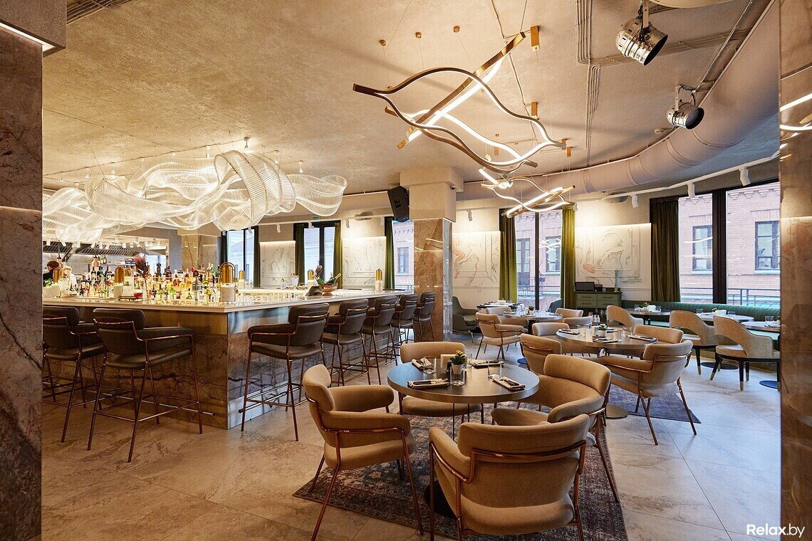 В интерьере отошли от стереотипов. Дизайнер выдержал тонкую грань: Maslow6 выглядит дорого, но непафосно. Доминирующий стиль — постмодернизм. Никакой монохромности, зато много контрастов. Во всем диктатура эстетики: натуральные материалы в отделке, невесомые светильники и главный акцент — парящая инсталляция над барной стойкой. В сочетании с массивными настольными лампами из мрамора она выглядит эффектно.