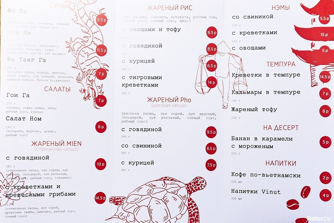 Сегодня в заведении особенно рекомендуют попробовать фирменный вьетнамский суп фо-бо. Блюдо готовится восемь часов и совершенно точно не имеет аналогов. Стоимость порции 500 граммов — 6,50 рублей.