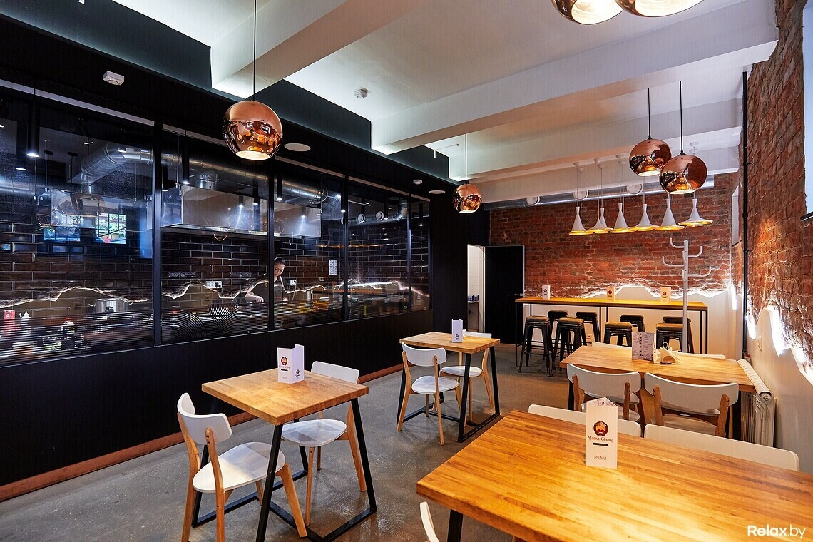 Свой дизайн кафе сохранило от предыдущего заведения: привычный глазу лофт с авторскими вкраплениями. Когда-то это был подвал с холодильными камерами, разделенный на три помещения, без входа и окон. Сегодня площадь Mama Chung — 120 квадратных метров, где примерно половину пространства занимает открытая кухня. Еще 60 «квадратов» — площадь зала, где могут разместиться около 20 человек.