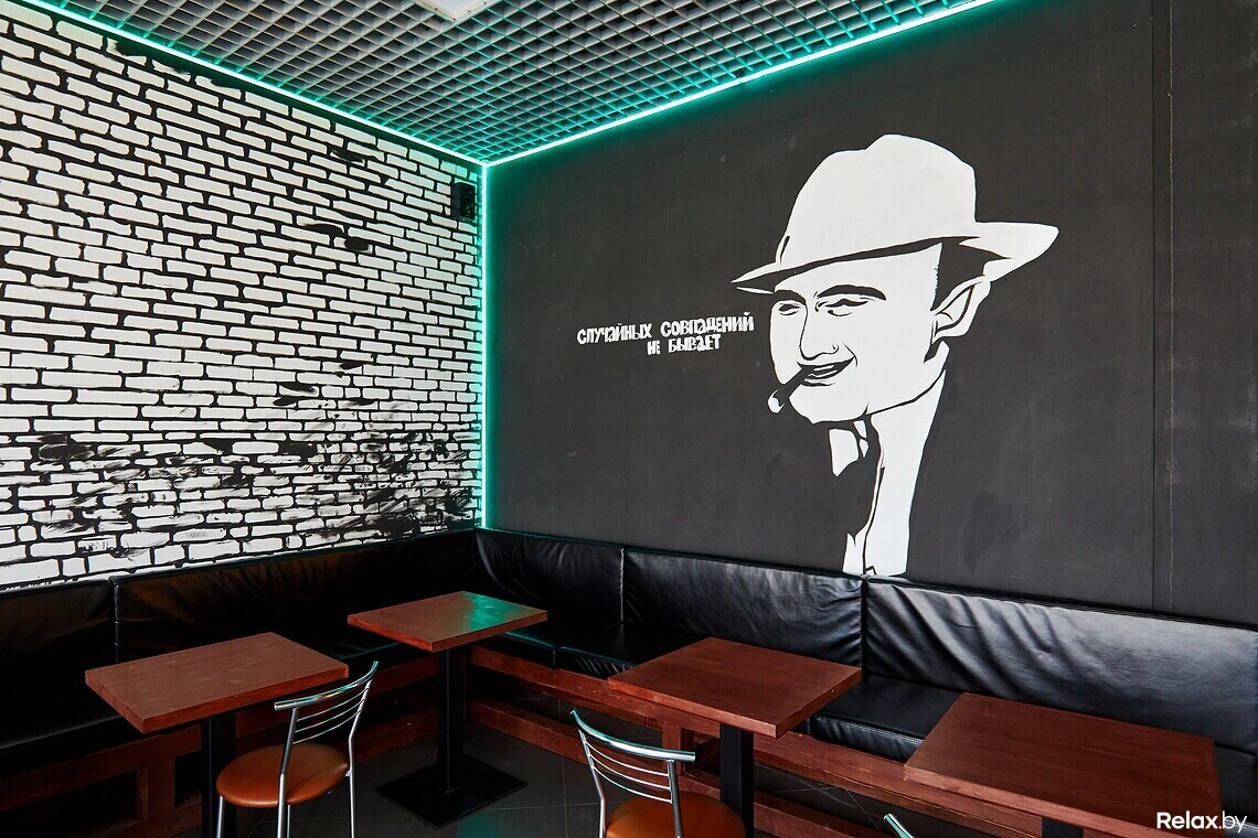 В зале можно выделить три зоны: барная стойка, мягкая зона с диванами и стулья у витринных окон. Семен рассказывает, что One Shot cafe&bar вдохновлен временами «сухого закона». Идею подчеркнули рисунками на стенах и большим выбором виски.