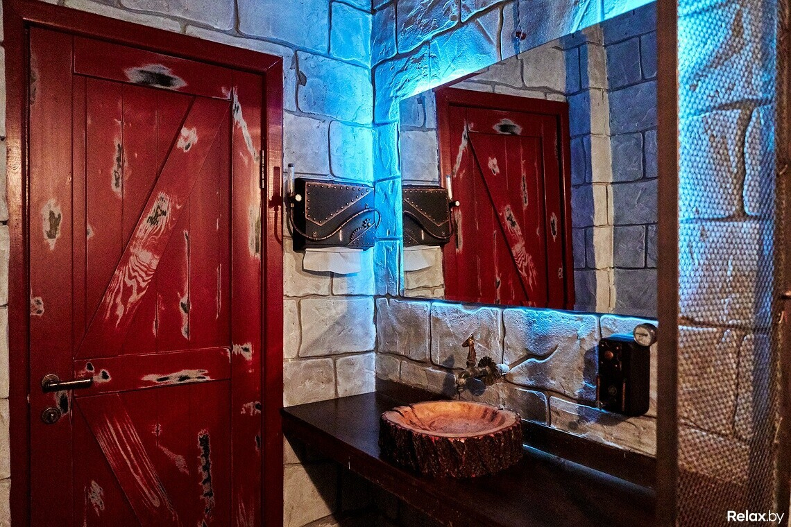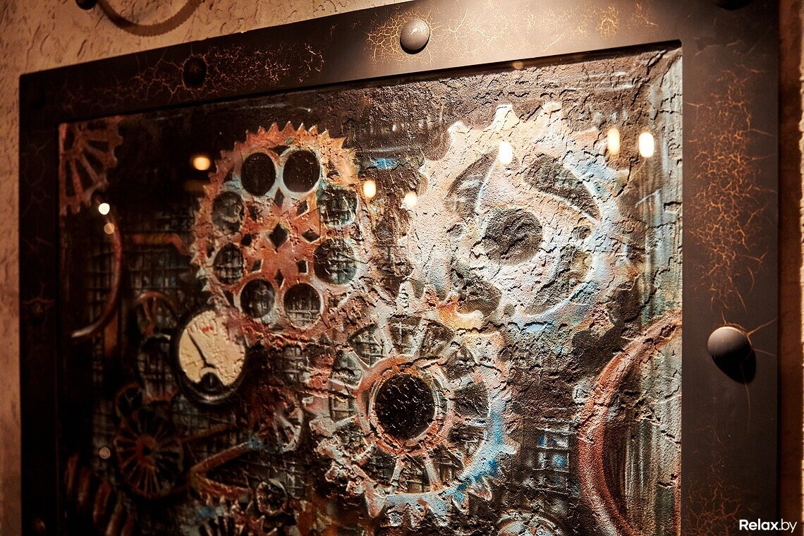 Если рассматривать интерьер более детально, можно заметить: в Facktory bar практически нет повторяющихся элементов. Каждая мелочь — от крючков под барной стойкой, камер видеонаблюдения до декора столешниц и картин, написанных прямо на стенах, — уникальна. Здесь все хочется рассматривать, а иногда даже пытаться понять: как вот этот огромный стол сумели внести в зал?